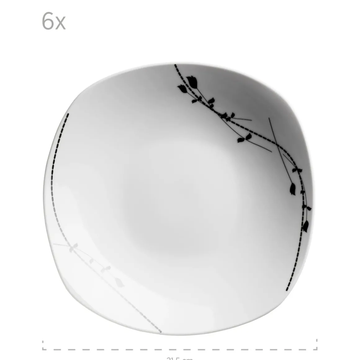 Edel und fast etwas mysthisch rankt das schwarze Blattdekor am Tellerrand entlang. Das Tellerset Londra ist genau die richtige Wahl für alle, die ein besonderes Geschirrset abseits von graphischen Mustern suchen. Die quadratische Form mit den abgerundeten Ecken sorgt für eine zusätzliche Abwechslung auf dem Esstisch. Das Tellerset Londra ist dauerhaft spülmaschinen- und mikrowellengeeignet, und dadurch äußerst pflegeleicht. Dieses Geschirr-Set wird in einer speziell für dieses Service entwickelten, vielfach getesteten Postversandverpackung aus umweltschonenden Materialien versendet. Bitte beachten Sie: Für eine objektive Vergleichbarkeit gehen unsere Füllmengenangaben von einer randvollen Befüllung aus. Aufgrund der besonderen Glasurtechnik kann es zu leichten Farbabweichungen kommen.