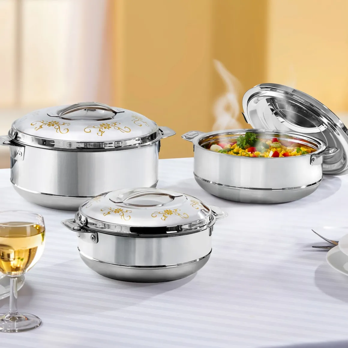Wenn sich die Gäste verspäten oder Speisen längere Zeit auf dem Büffet bereitstehen, ist es wichtig, die Lebensmittel möglichst lange und gut warm zu halten, ohne dass sie nachgaren. So bleiben Fleisch und Fisch saftig und Gemüse knackig. Die Thermoschüssel Galant erfüllt nicht nur diese Aufgabe perfekt, sondern sieht dazu auch noch besonders edel aus.