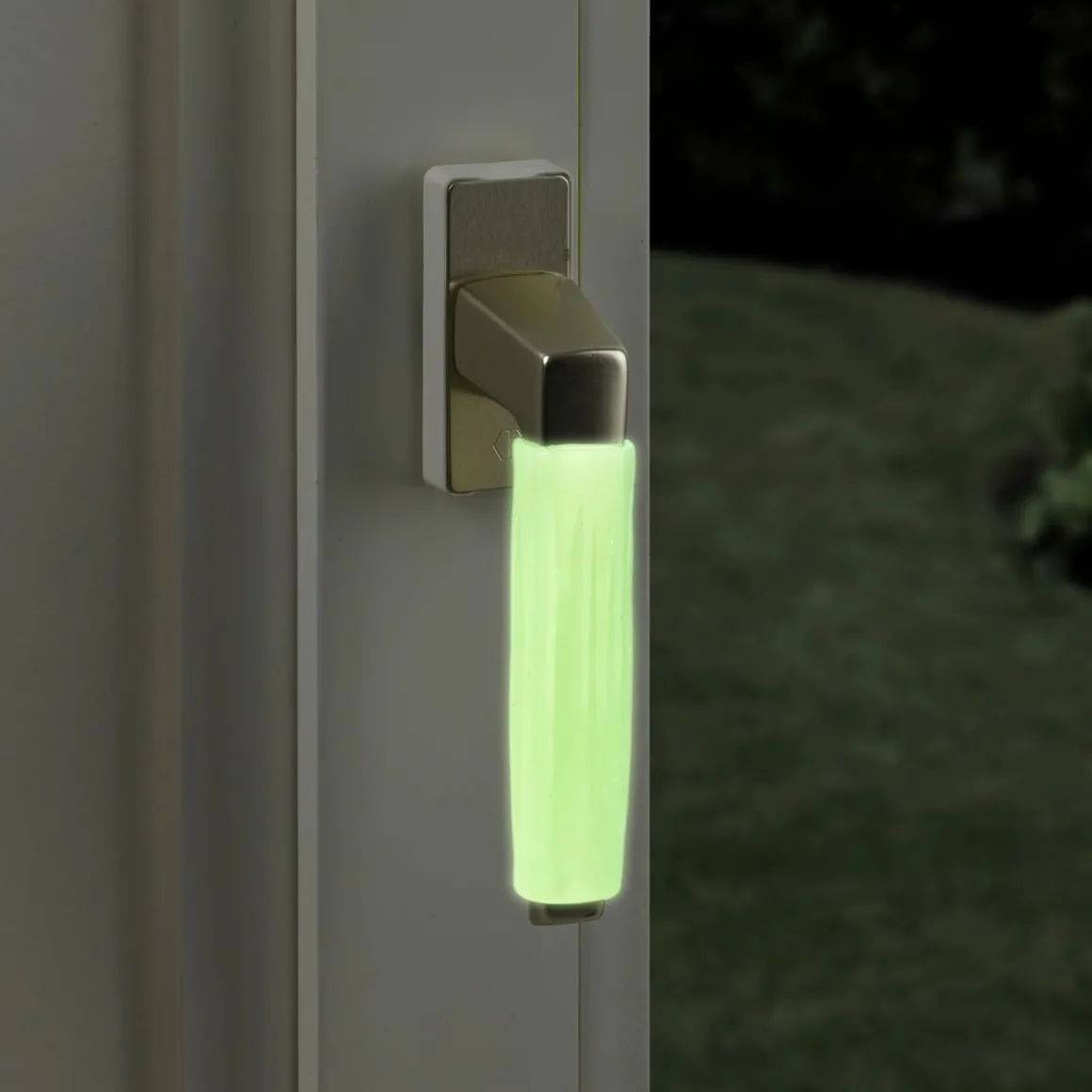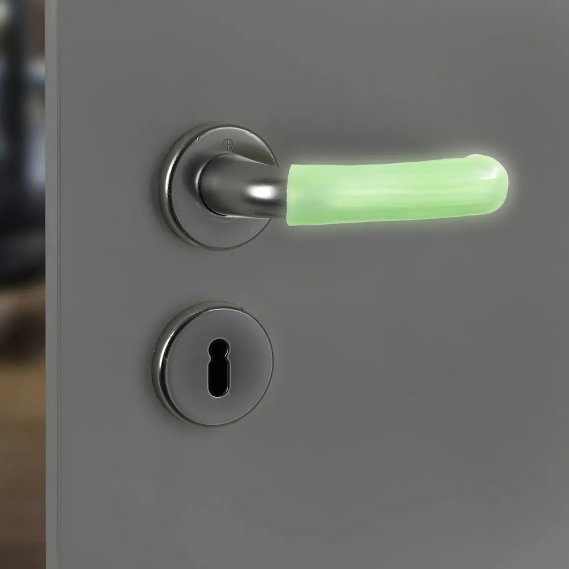 Hier geht’s lang! Über Türklinken oder Fenstergriffe gestülpt, zeigen Ihnen die nachtleuchtenden Helfer den Weg. Dehnbares Material, passend für alle Griffe bis Ø 2,5 cm.