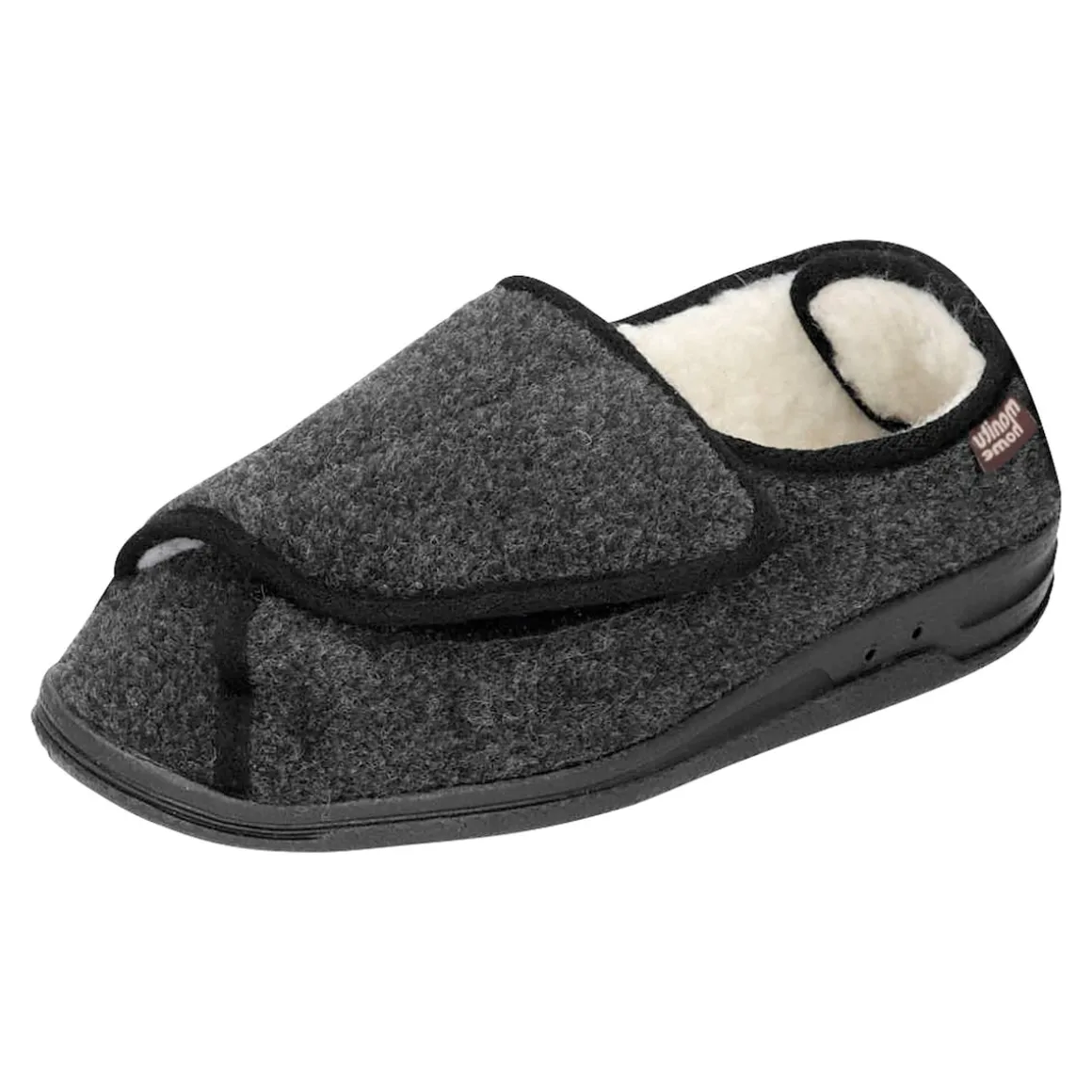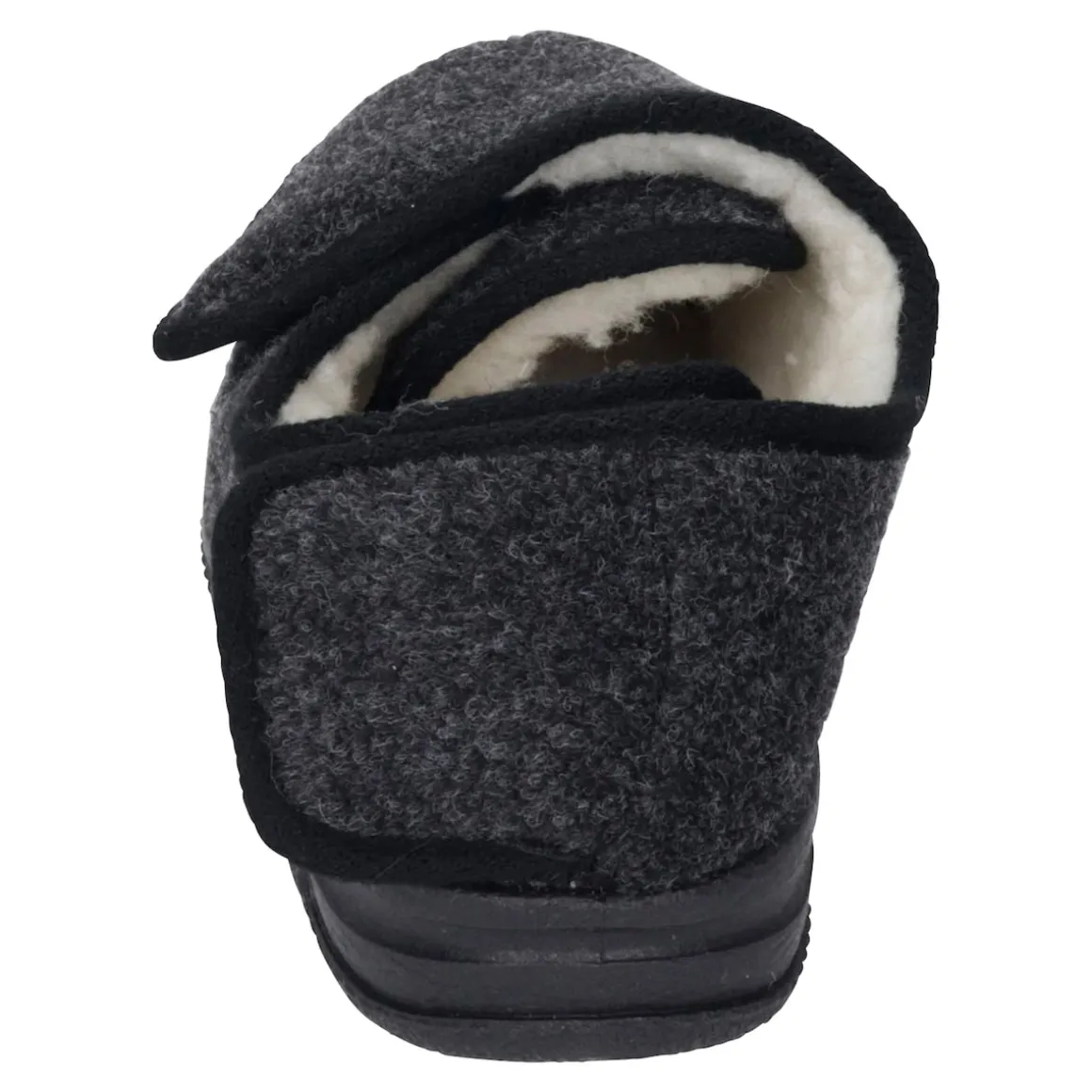 Natürlich warm: Obermaterial Filz, innen kuschelweiches Schurwoll-Futter. Komplett zu öffnen, mit Klettverschlüssen vorne und hinten individuell einstellbar. Rutschhemmende Laufsohle.