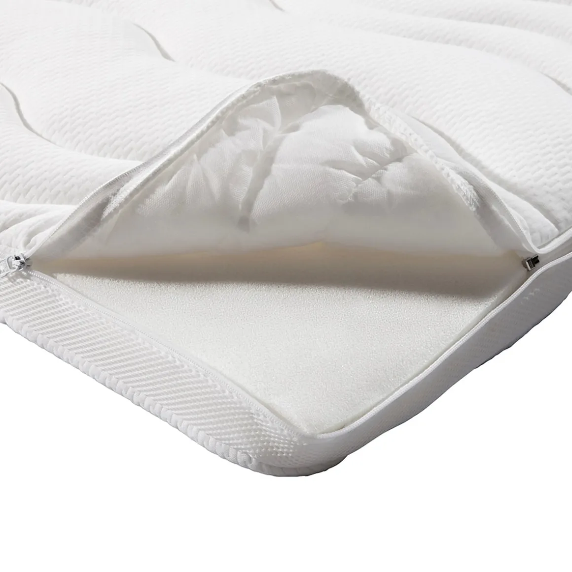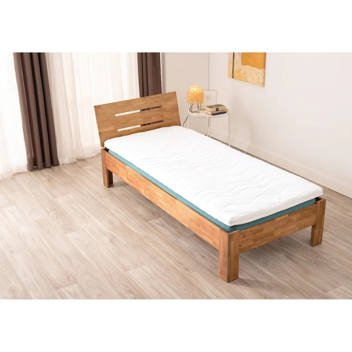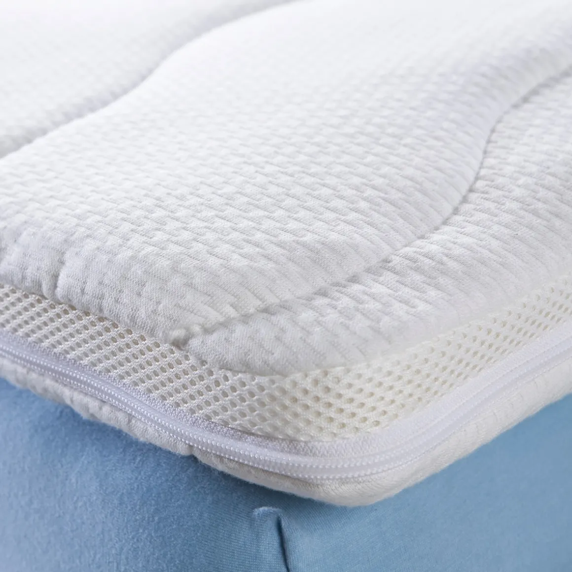 Als Bezug für den Kern aus Viscoschaum dient medizinisch getestetes Doppeljersey aus 100 % Polyester, das auf eine Klimafaser (beidseitig, 150 g/m2) gesteppt ist. Die Klimafaser sorgt ebenso wie das umlaufende Lüftungsband für eine gute Atmungsaktivität und optimalen Wärme- und Feuchtigkeitsaustausch der Matratzenauflage. Mit dem umlaufenden Reißverschluss lässt sich der Bezug einfach von dem antiallergisch ausgerüsteten Schaumkern trennen und bei 60 °C in der Waschmaschine reinigen. Nach dem Waschen können Sie den Bezug in den Trockner geben. Damit ist der hochwertige Topper auch für Menschen mit Allergie gegen Hausstaubmilben geeignet.