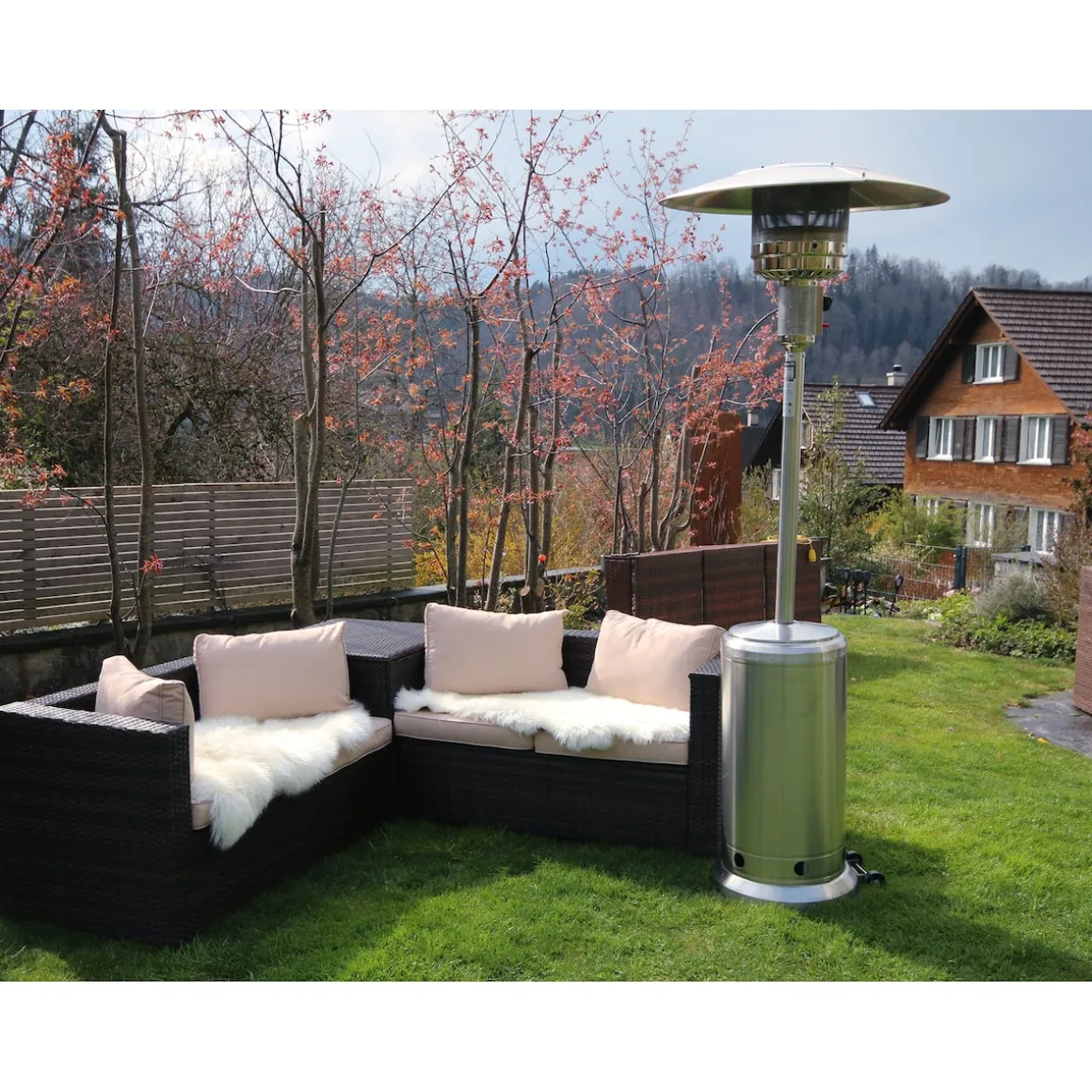 Die Aussenheizung wird mit Gas betrieben und verfügt über eine Piezo-Zündung. Der Heizkörper wird sekundenschnell aufgewärmt und ist unabhängig von einem Stromanschluss. Dank des Schutzgitters und der Sicherheitsflammlöschvorrichtung ist der WÄRMEPILZ sehr sicher.