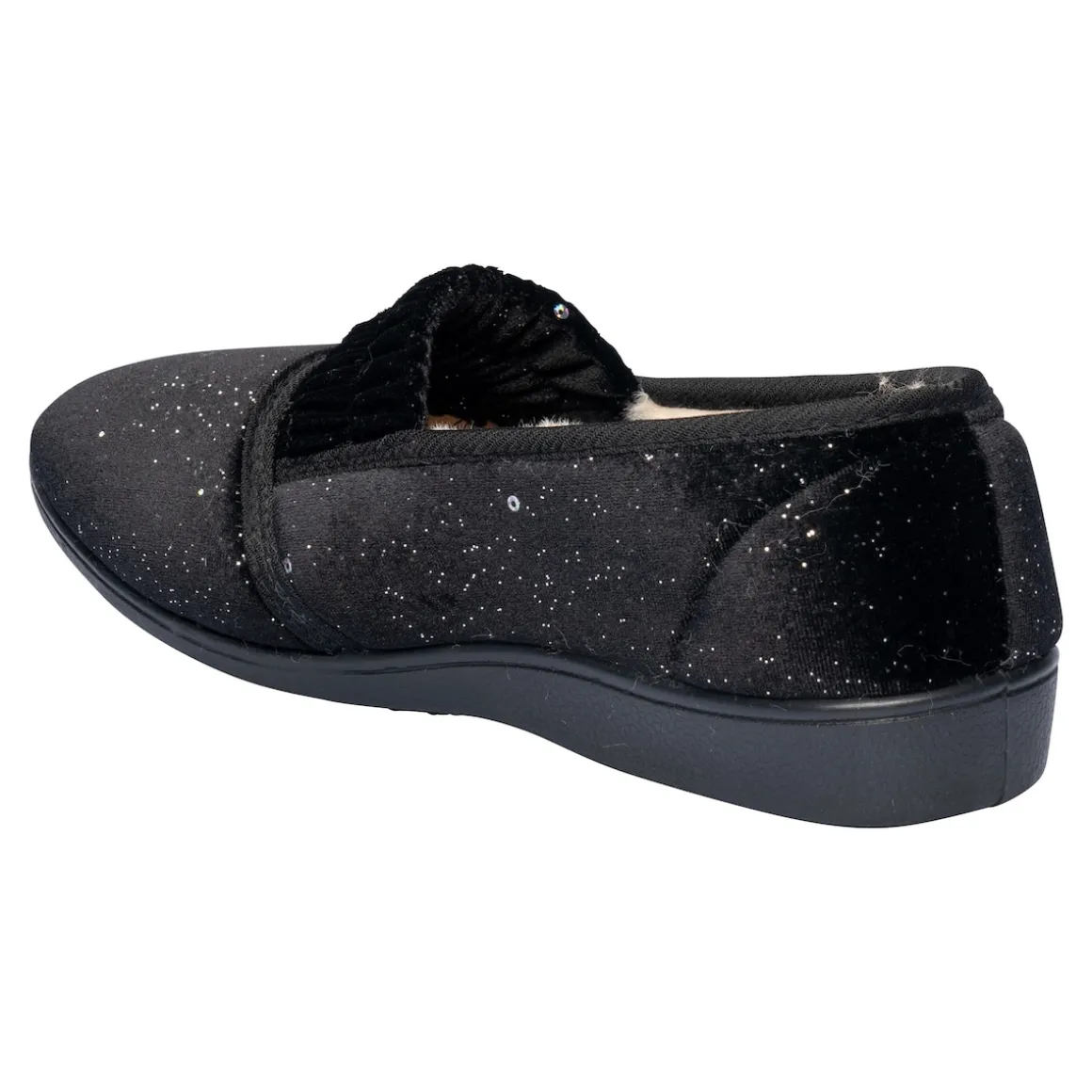 Freuen Sie sich auf einen Hausschuh, der Ihren Schritten einen funkenden Auftritt verleiht: Mit seinem warmen Futter und den dezenten Glitzerpailletten bietet er nicht nur einen Hauch von Glamour, sondern auch höchsten Tragekomfort. Für einen leichten Ein- und Ausstieg und optimalen Sitz sorgen die elastischen Einsätze über dem Rist. Mit weicher Decksohle und rutschhemmender Laufsohle.