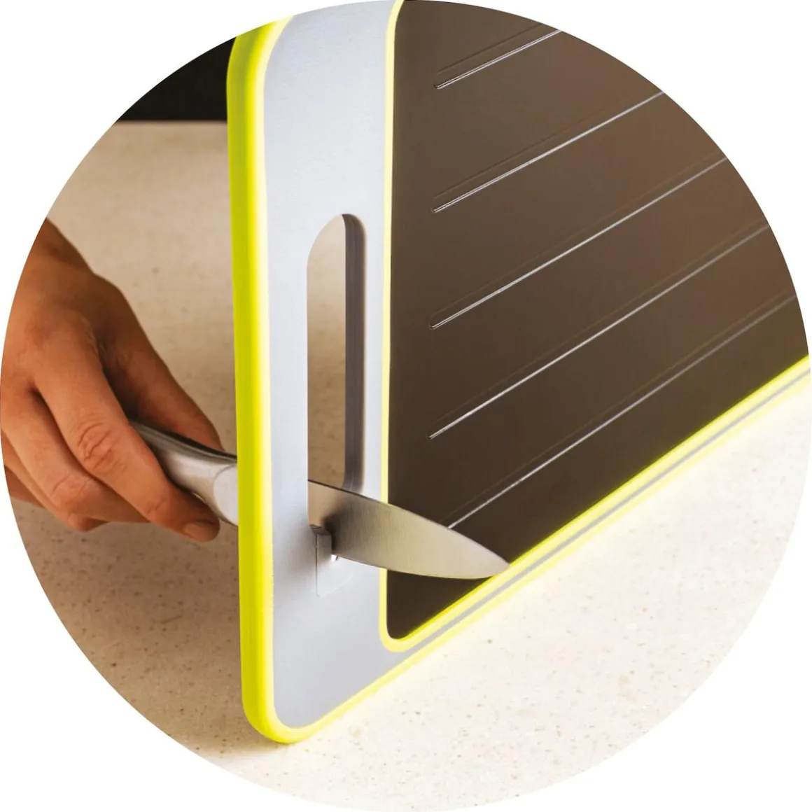 Wenden Sie das Brett und Ihr Auftaubrett wird zum Allzweck-Schneidebrett. Mit dem integrierten Messerschärfer können Sie in Windeseile Ihre Messer schärfen.