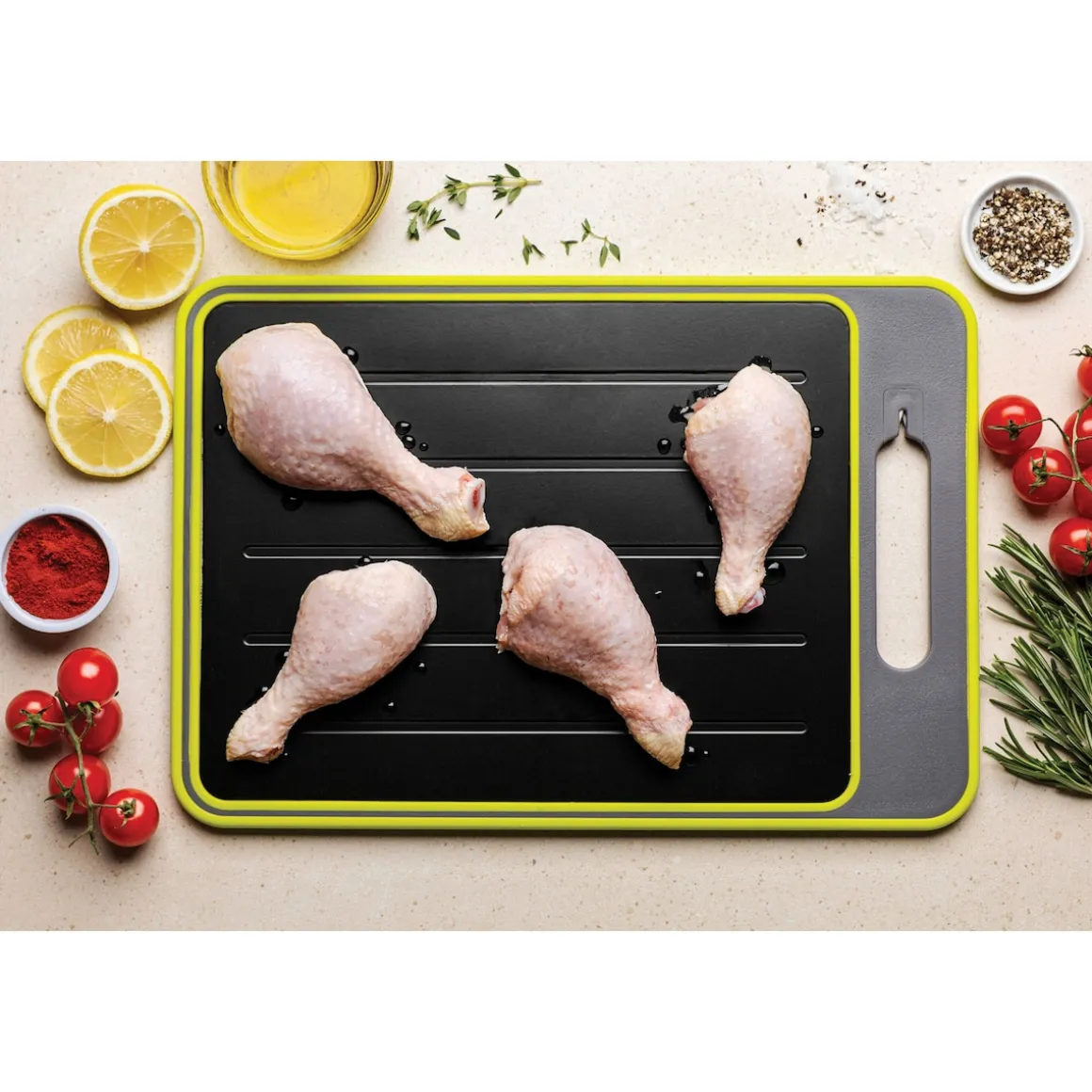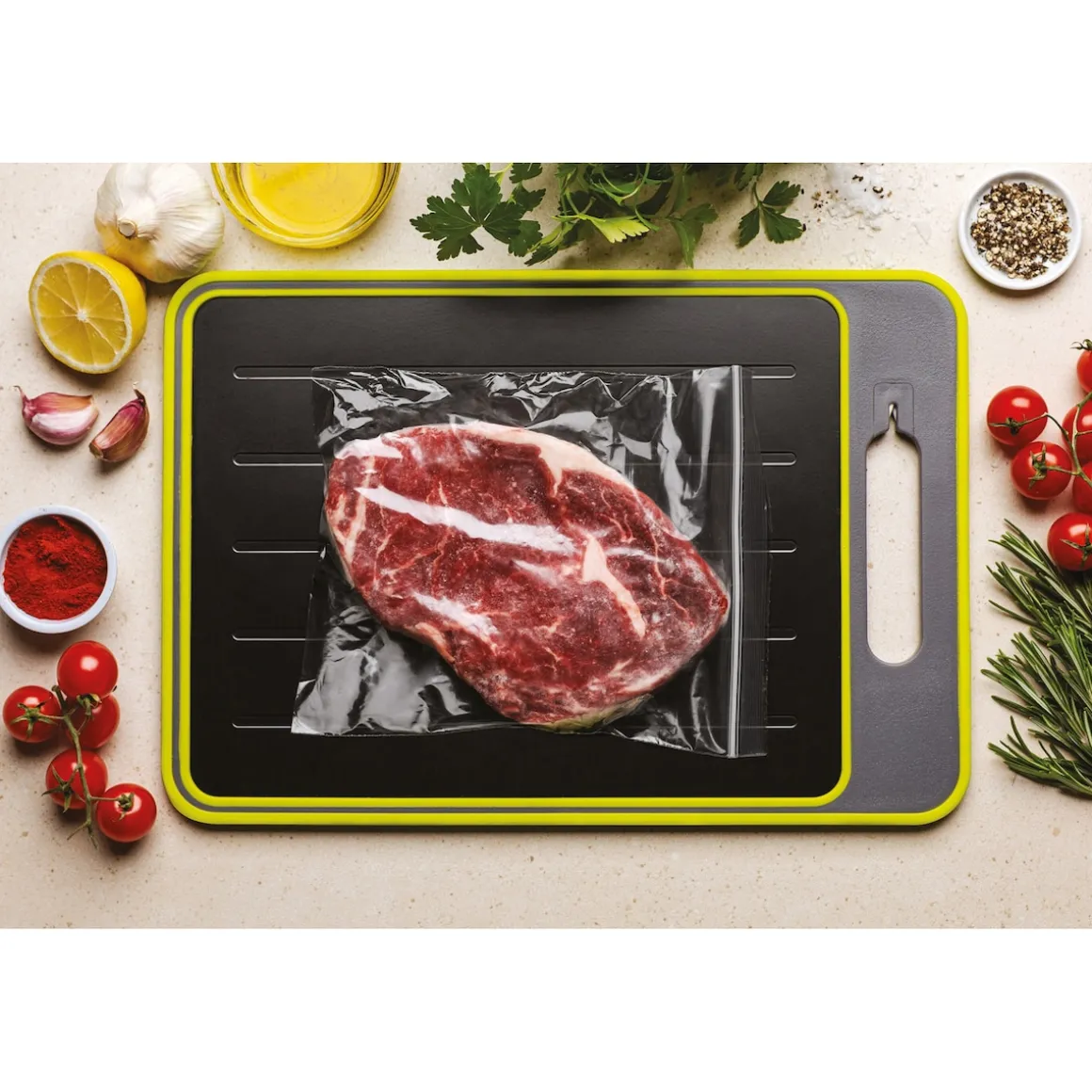Livington FrostAway ist ein wahres 4in1 Küchenwunder – Auftaubrett, Schneidebrett, Messerschärfer und Reibe in Einem! Tauen Sie bis zu 3x schneller Lebensmittel auf, ohne jeglichen Qualitäts- oder Geschmacksverlust.