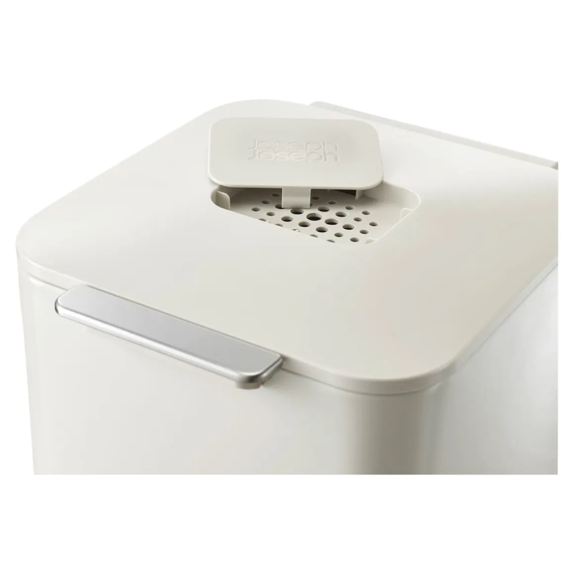 Der Totem Max überzeugt nicht nur durch sein modernes Design, sondern auch durch seine praktische Handhabbarkeit und Strapazierfähigkeit. Er verfügt über einen belüfteten Geruchsfilter im Hauptdeckel, der unangenehme Gerüche effektiv minimiert. Zusätzlich bietet der herausnehmbare Bioabfalleimer mit drei Litern Fassungsvermögen maximale Flexibilität. Er kann in einem der Fächer untergebracht oder zur Befüllung auf die Arbeitsfläche gestellt werden.