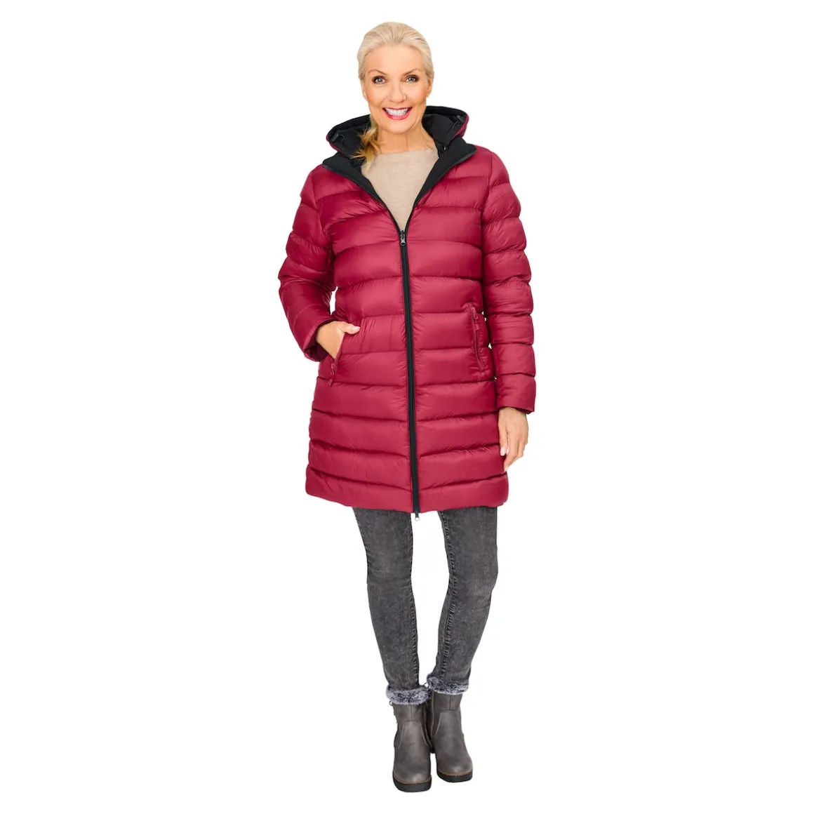 Kaltes Schmuddelwetter? Mit „Mara“ sind Sie immer passend angezogen! Ihre neue Begleiterin punktet mit einer bordeauxfarbenen Steppseite und einer schwarzen Softshell-Seite, die Sie bei Bedarf im Nu gewendet haben. Eine abnehmbare Kapuze und 2 seitliche Eingrifftaschen mit Reißverschluss runden den Tragekomfort der wasser- und windabweisenden Jacke ab.