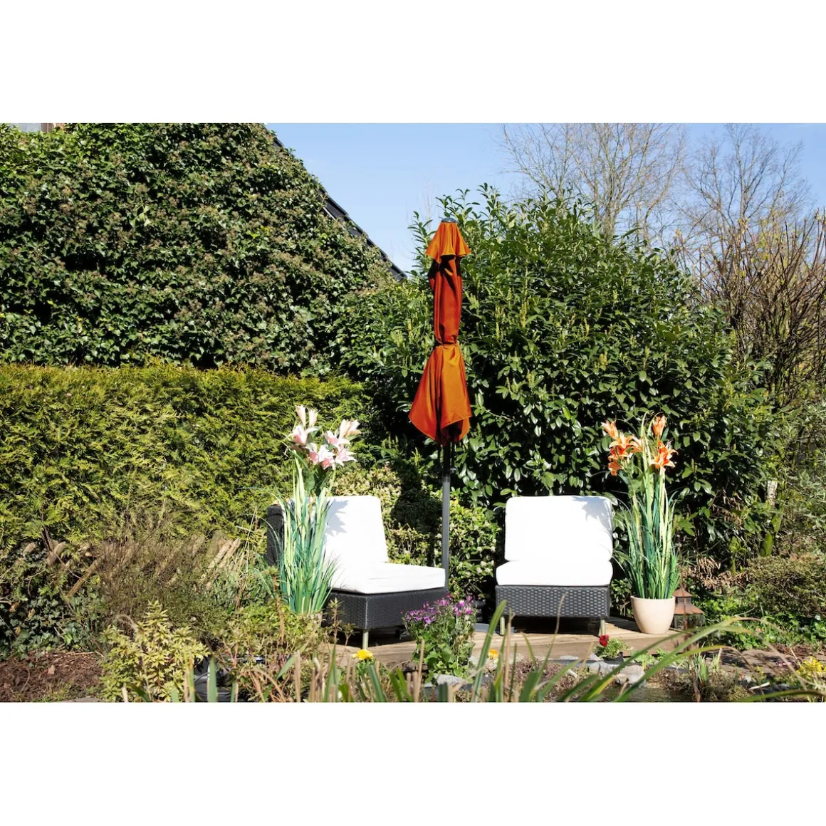 Genießen Sie die Sonne sicher mit dem Ampel-Sonnenschirm Greenday. Dank UV-Schutz 50+ sind Sie optimal geschützt. Die Teleskoptechnik ermöglicht eine vollständige Nutzung der Schattenfläche, egal ob im Garten oder auf dem Balkon. Der Schirm ist leicht zu öffnen und bleibt dank des stabilen Kreuzfußes sicher stehen, nachdem er leicht beschwert wurde. Mit einem Durchmesser von 2,70 m und wasser- sowie sonnenabweisendem Polyesterbezug genießen Sie den Sommer im Schatten. Der Schirm ist einfach aufzubauen und perfekt für Reisen.