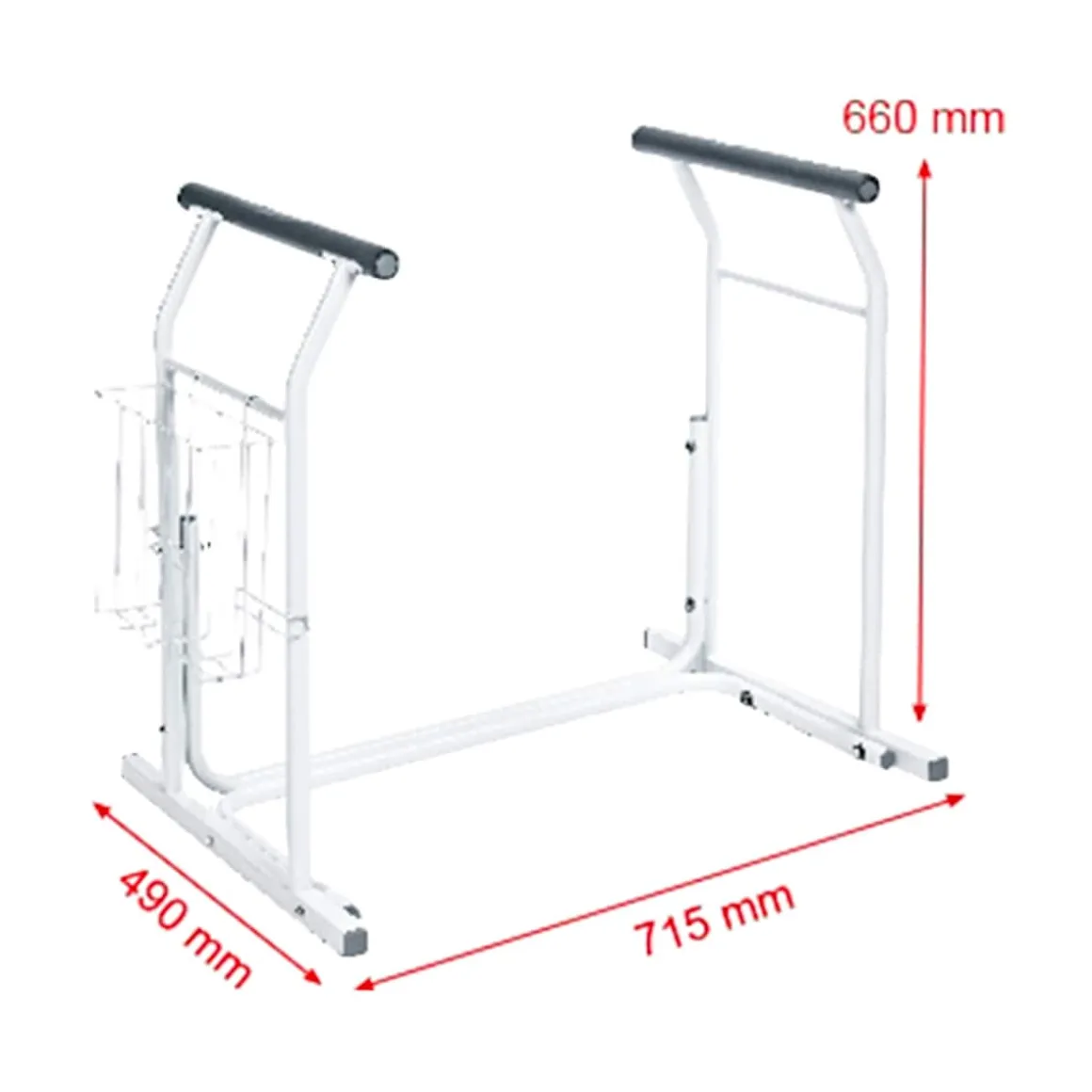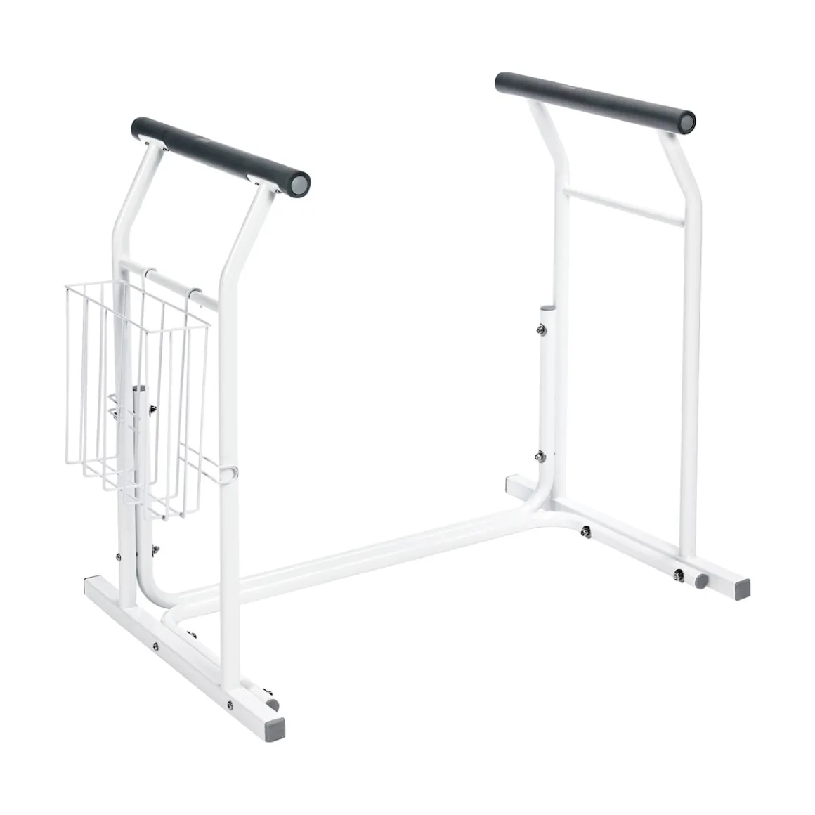 Der stabile Rahmen des Aufsteh- und Stützgeländers ist aus hochwertigem Stahl gefertigt. Kunststoffpuffer sorgen für einen festen Stand und verhindern ein Rutschen und Kratzer auf dem Boden. Ein Schaumstoffüberzug verleiht den ergonomischen Griffen eine gute Griffigkeit und ermöglicht einen festen, sicheren Halt. Die Aufstehhilfe ist mit einem Ablagekorb ausgestattet, der rechts oder links eingehängt werden kann. In ihm lassen sich Accessoires wie Zeitung, Buch oder Smartphone griffbereit aufbewahren. Das für den Aufbau benötigte Montagewerkzeug ist im Lieferumfang enthalten. Wird die Aufstehhilfe nicht mehr benötigt, lässt sie sich auch schnell wieder zerlegen.