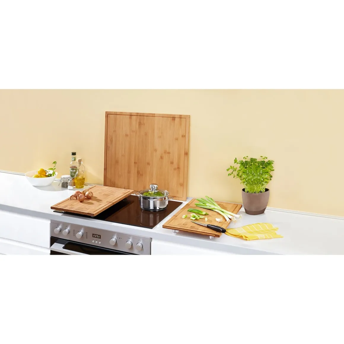 Gleich 2 wertvolle, natürliche Materialien stehen für Sie bei diesen Schneidebrettern zur Auswahl: Bambus – beliebt, hart, schnittfest, hygienisch … die preiswerte Variante, ideal auch für junge Haushalte! Akazie – elegant, wunderschön gemasert, unverwüstlich … die hochwertige Alternative „für immer“! Zeitlos, praktisch und hygienisch, mit rutsch- und kratzfesten Kunststoff-Füßchen und Saftrinne. Auch als robuste, herdschonende Abdeckplatte oder als Spritzschutz zu verwenden.