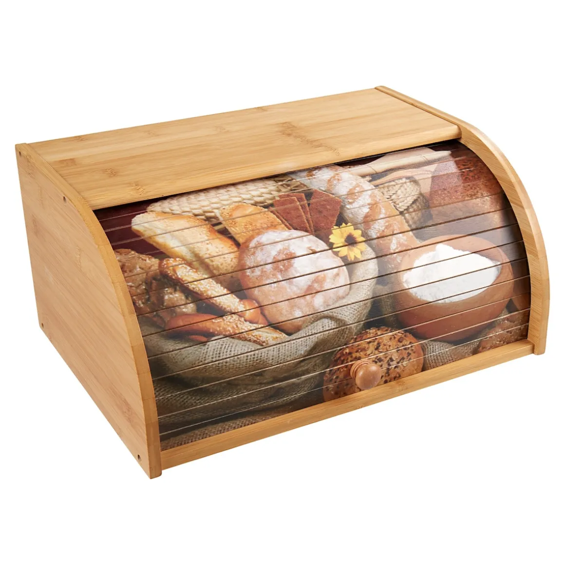 Der Bambus-Rollbrotkasten mit passendem Motiv zieht in der Küche alle Blicke auf sich und hält Ihr Brot lange frisch! Durch seine Größe können Sie auch mehrere Brote gleichzeitig darin aufbewahren. Auf der flachen Oberseite können Sie außerdem Vorratsdosen abstellen und dadurch Platz sparen.