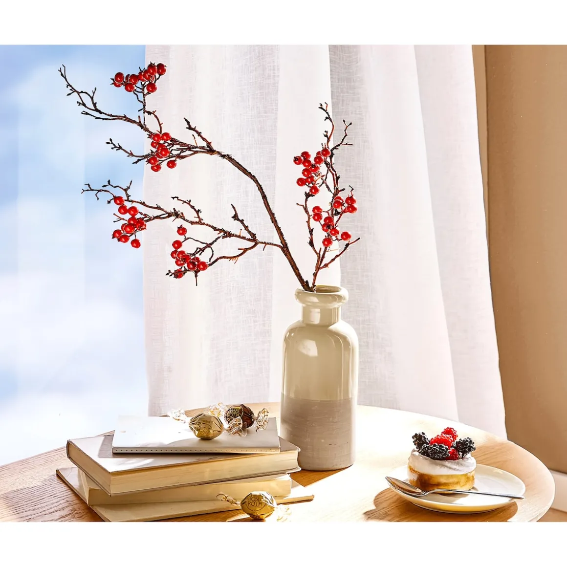 Bringen Sie mit diesem täuschend echt aussehenden Beerenzweig die Schönheit der Natur in Ihr Zuhause – eine stilvolle Dekoration, die Ihrem Wohnraum eine sowohl eine charmante als auch festliche Note verleiht.