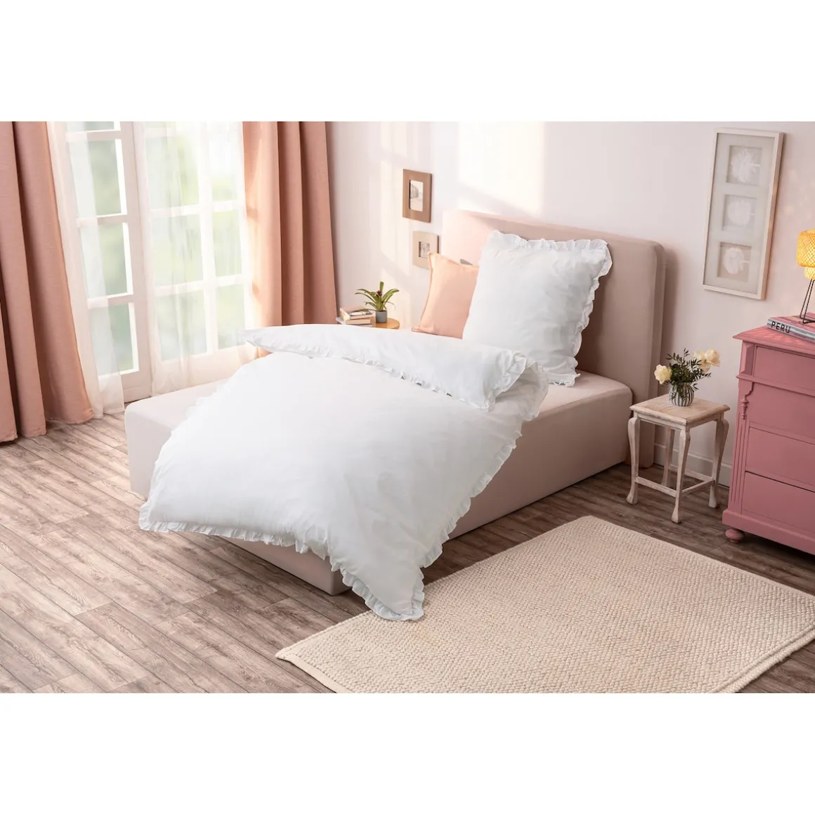 Lassen Sie sich von dieser Bettwäsche verzaubern. Das 2-teilige Set aus hochwertigem Material besticht durch eine verspielte Rüschen-Bordüre, die Ihrem Schlafzimmer eine zarte und elegante Atmosphäre schenkt. Dank der praktischen Reißverschlüsse gelingt das Beziehen mühelos und schnell. So genießen Sie ein angenehmes Schlafgefühl in stilvoller Umgebung, die zum Wohlfühlen einlädt. Entdecken Sie jetzt diese exklusive Bettwäsche und bringen Sie Romantik in Ihr Zuhause.