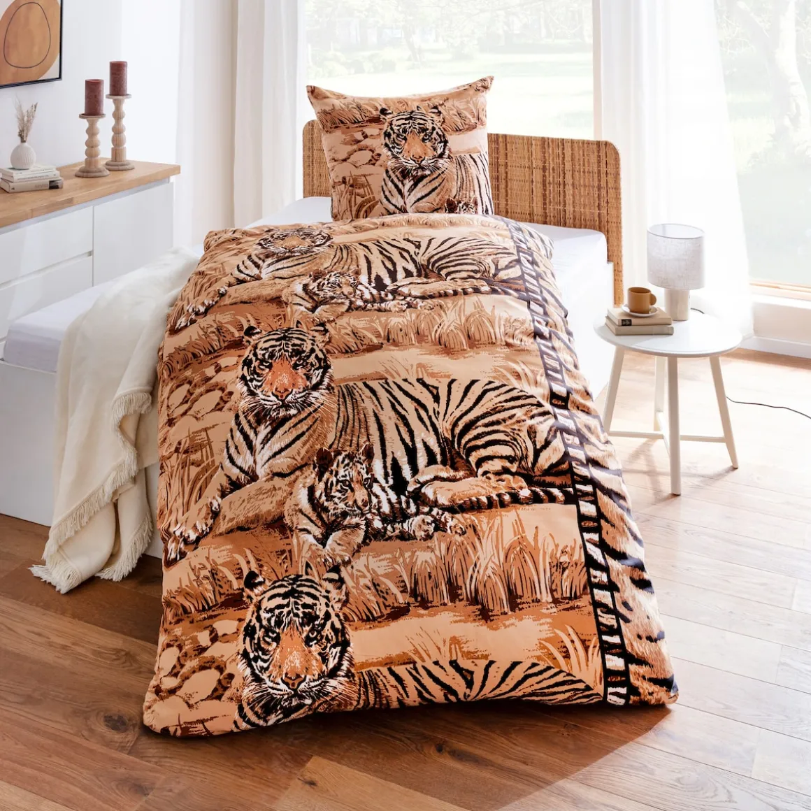 Lassen Sie sich von Tiger „Shir Khan“ in die Welt der Träume entführen! Der majestätische Tiger begleitet Sie sanft durch die Nacht und verwandelt Ihr Bett in eine gemütliche Dschungel-Oase. Das pflegeleichte Mikrofaser-Material ist nicht nur unglaublich weich, sondern sorgt auch für eine erholsame und entspannte Nacht. Der Reißverschluss erleichtert das Beziehen und Abziehen der Bettwäsche.