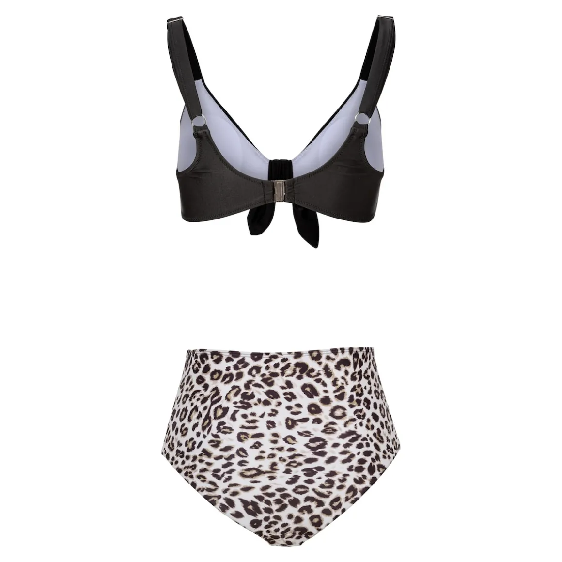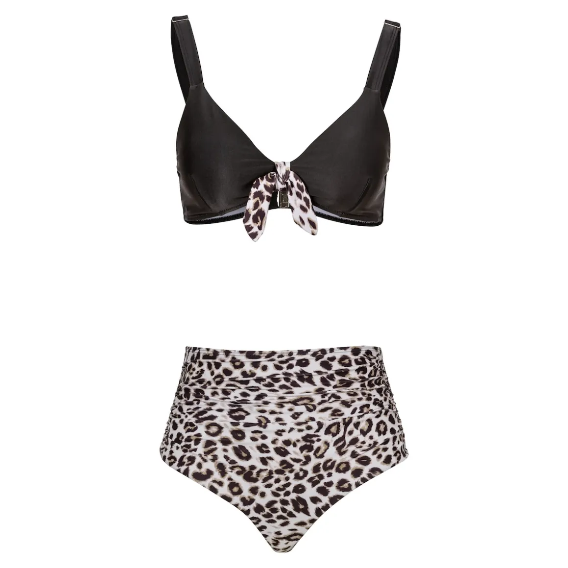 Gesucht – gefunden! Dieser Trend-Bikini punktet mit High-Waist-Hose in Leo-Optik und schwarzem Oberteil inkl. Wechselschleife in Leo. Mit herausnehmbaren Cups.