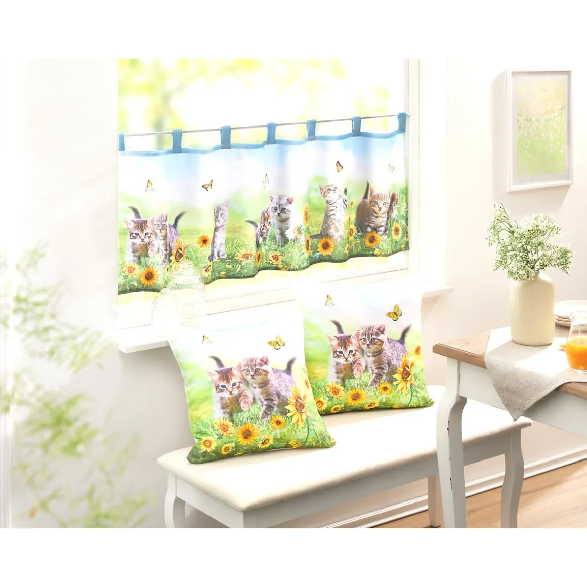 Diese Bistrogardine begeistert mit einem liebevoll gestalteten Fotodruck verspielter Katzen – perfekt für alle, die tierische Wohnakzente lieben. Der farbintensive Druck bringt Farbe und Freude an jedes Fenster und sorgt für eine freundliche, lichtdurchflutete Atmosphäre. Ob in der Küche, im Bad oder im Kinderzimmer: Die halbtransparente Gardine bietet Sichtschutz, ohne den Raum zu verdunkeln. Sie ist pflegeleicht, waschbar und schnell aufgehängt – so wird jeder Blick nach draußen zum kleinen Vergnügen.