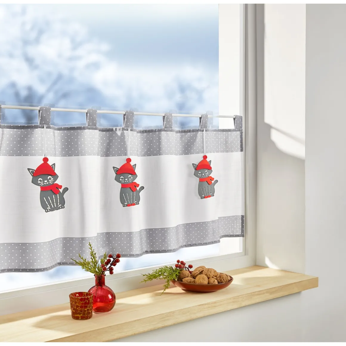 Jedes Kätzchen liebt seinen Fensterplatz! Hier sind es gleich mehrere, die Sie sich mit dieser Bistrogardine nach Hause holen können. Weihnachtsflair bringen die Samtpfoten direkt mit!