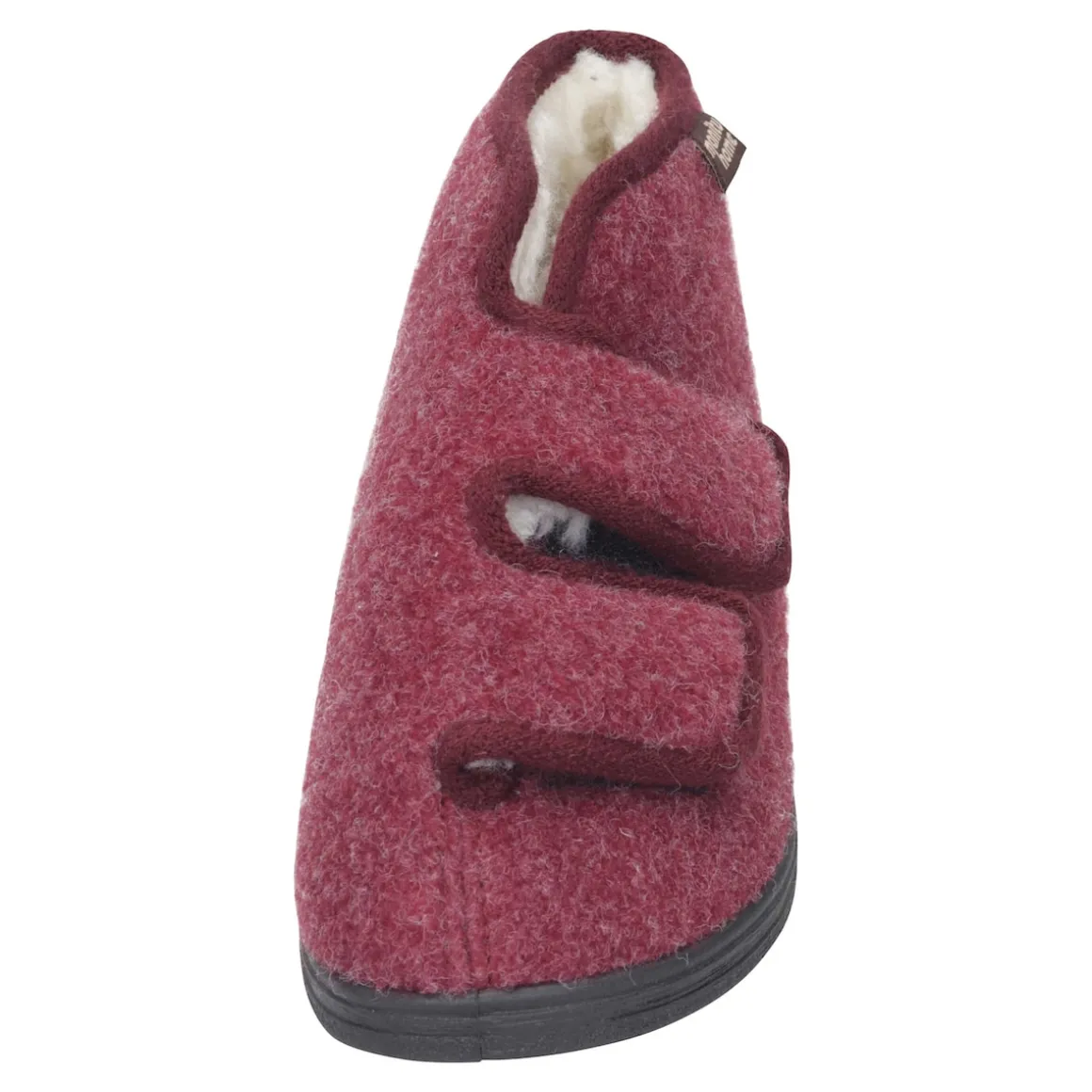 Filz und Schurwolle halten hier die Füße warm. Weit zu öffnen, für einfaches An- und Ausziehen. Mit Klettverschluss. Obermaterial Filz, Decksohle aus Wolle, Futter aus Schurwolle. Rutschhemmende PVC-Laufsohle.