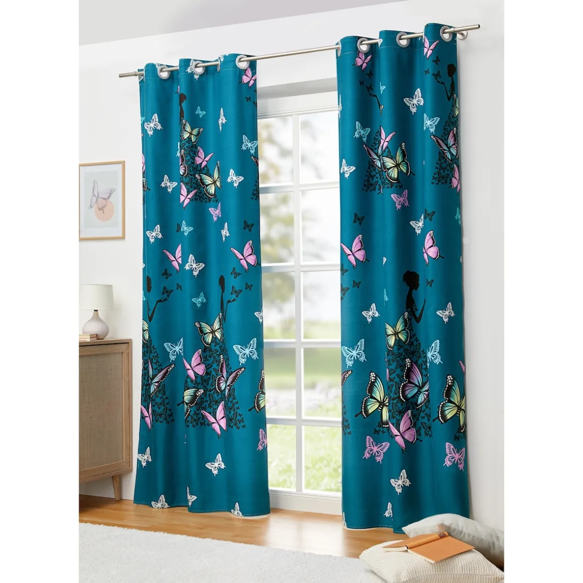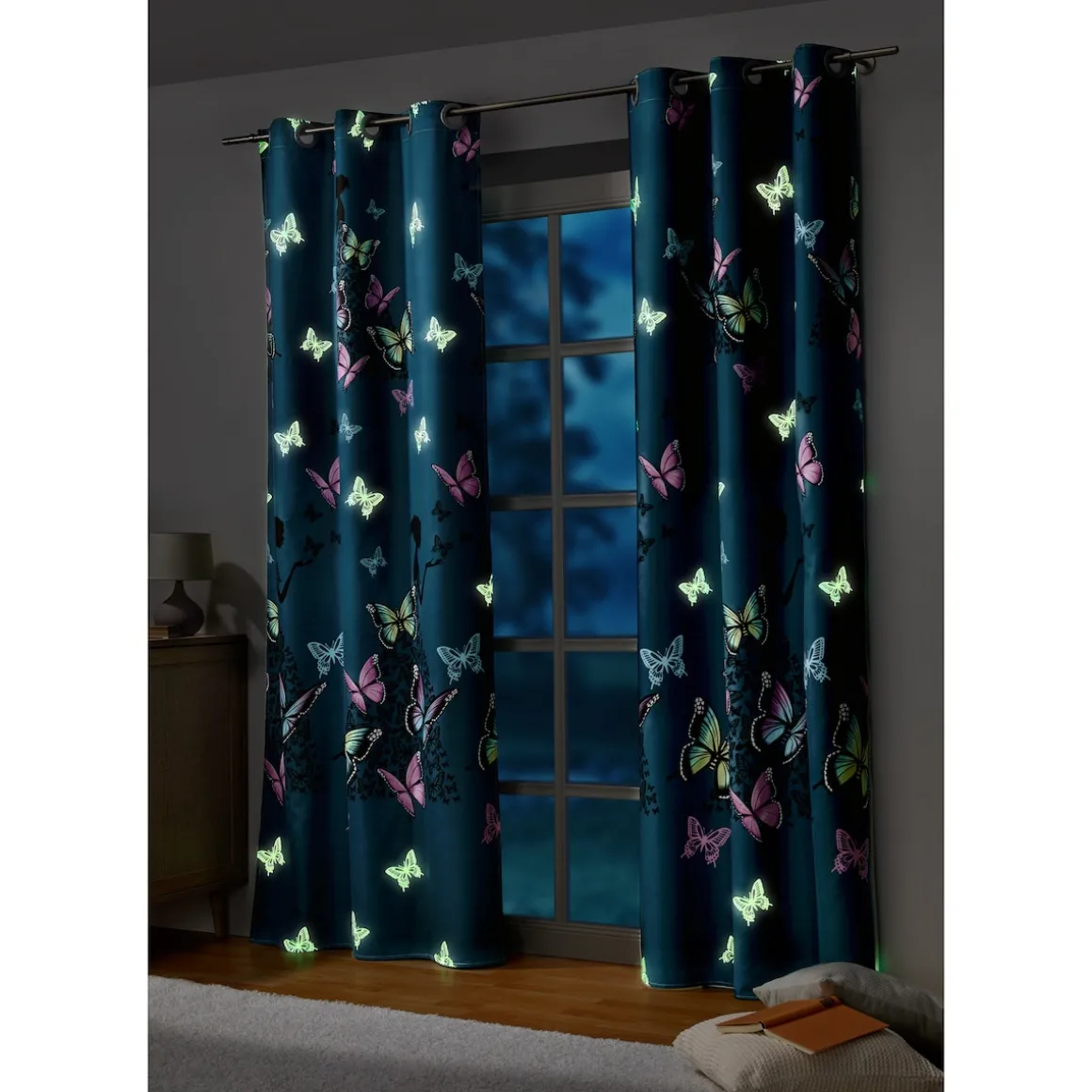 Nachtleuchtende Romantik: Tagsüber fliegt ein Schwarm filigraner Schmetterlinge über den Vorhang, in der Nacht fängt er an, geheimnisvoll zu leuchten – der Effekt ist fantastisch! Das Material ist zudem blickdicht und eignet sich auch perfekt zur Abdunklung von Räumen!