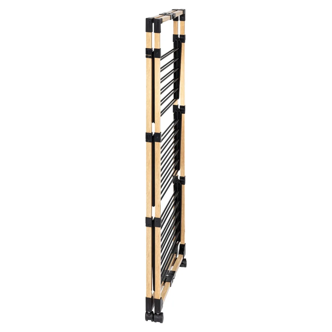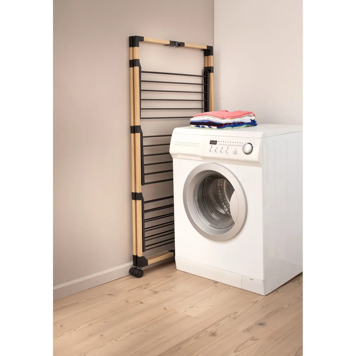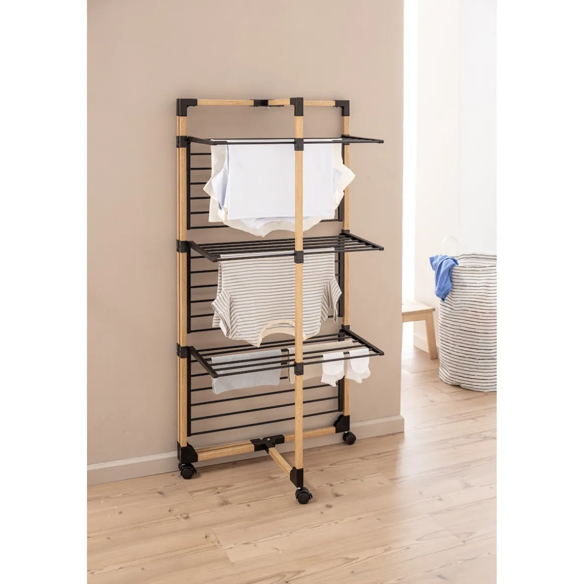 Wäscheständer, die viel Platz wegnehmen, gehören endlich der Vergangenheit an! Denn dieses Exemplar besticht durch 3 Ebenen, wo andere nur eine zu bieten haben – und hält dadurch Platz für die dreifache Menge an Wäsche bereit. Durch sein kompaktes Design lässt er sich bei Nichtgebrauch auf eine Breite von nur 5 cm zusammenklappen und platzsparend verstauen. Praktisch: Dank Rollen leicht verschiebbar. Trockenfläche: 23 m.