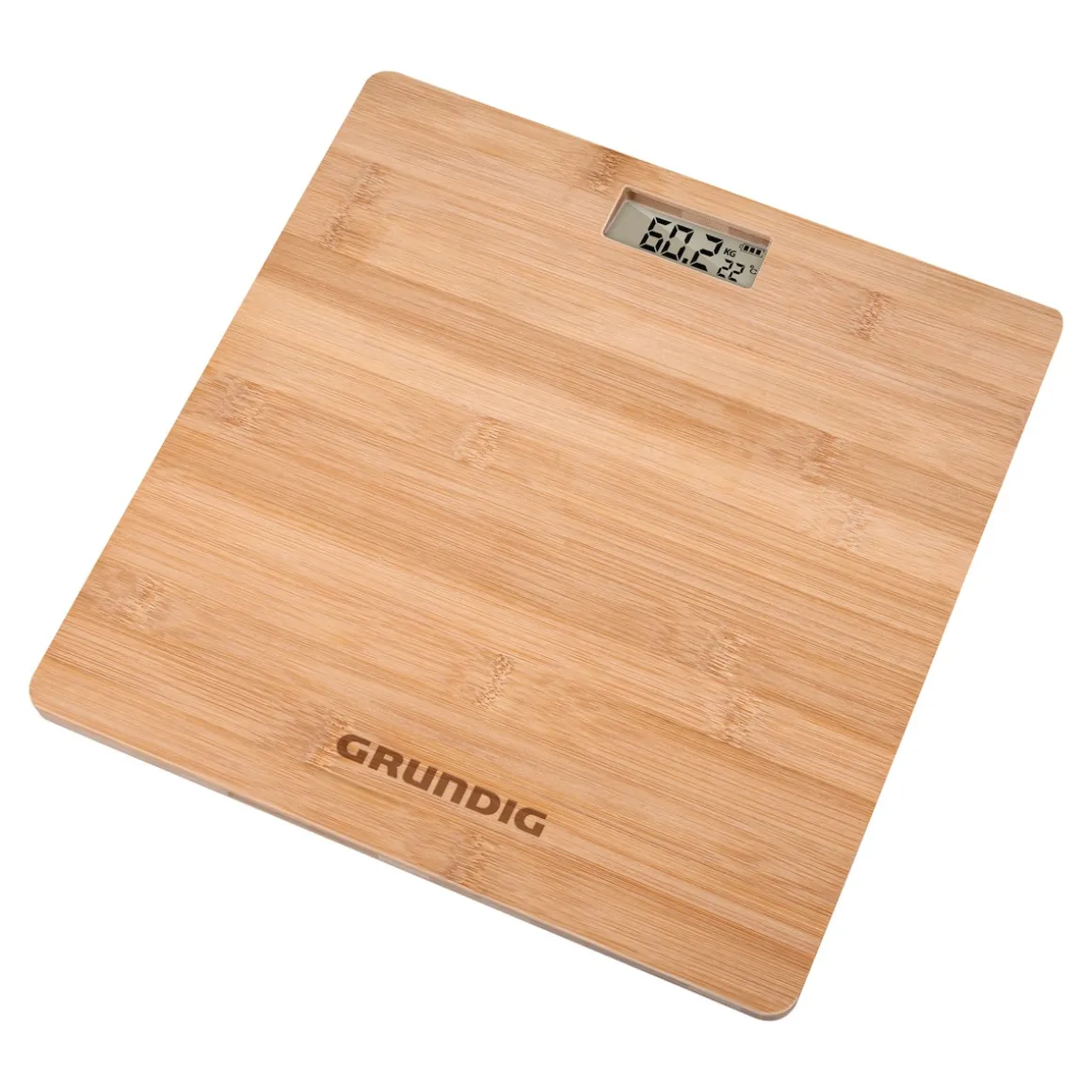 Digitale Personenwage mit LCD-Anzeige und 4 hochpräzisen und speziell entwickelte Grundig Hi8 Gewichtssensoren. Mit Anti-Shake- und Anti-Weight-Shift-Technologie. 50 g Einteilung.