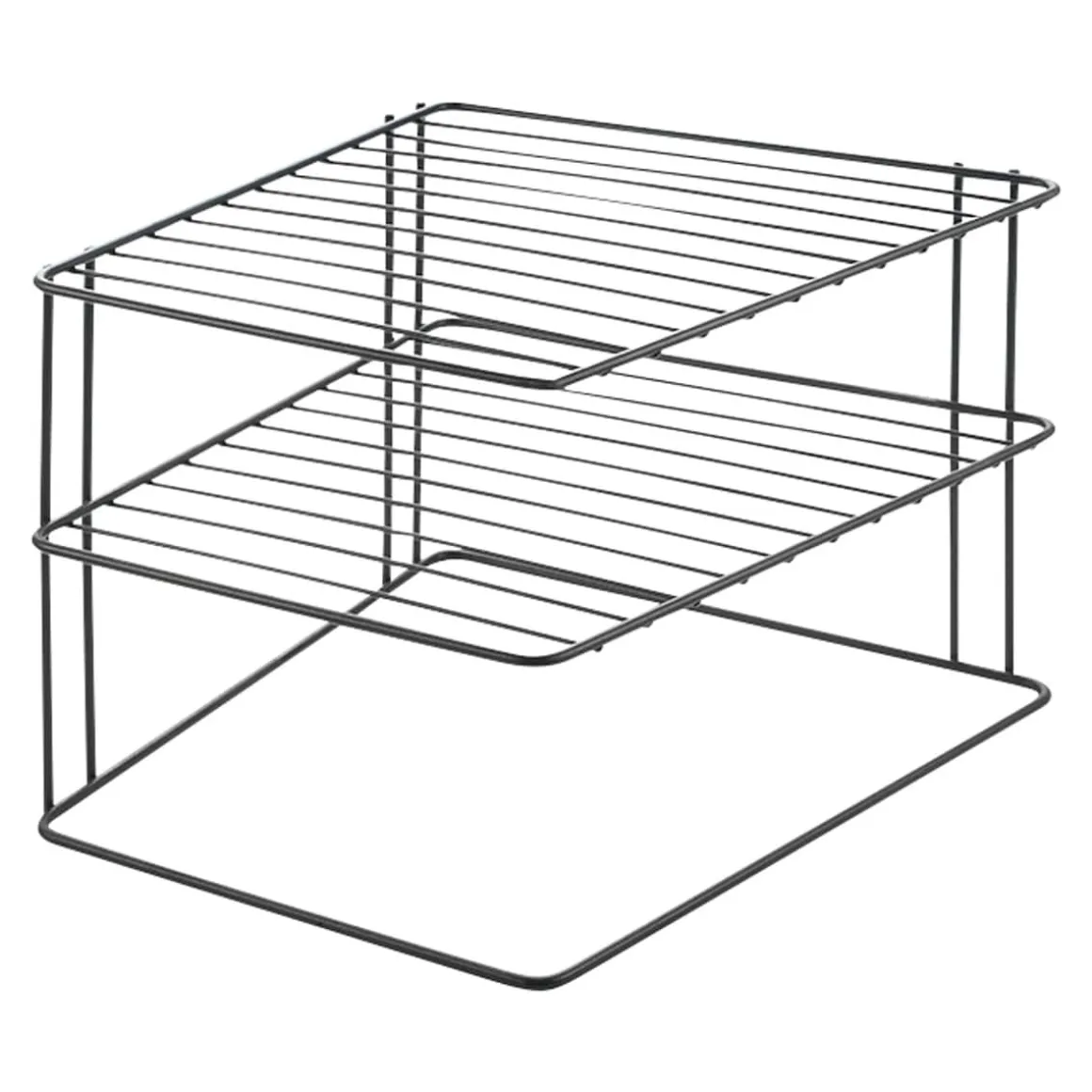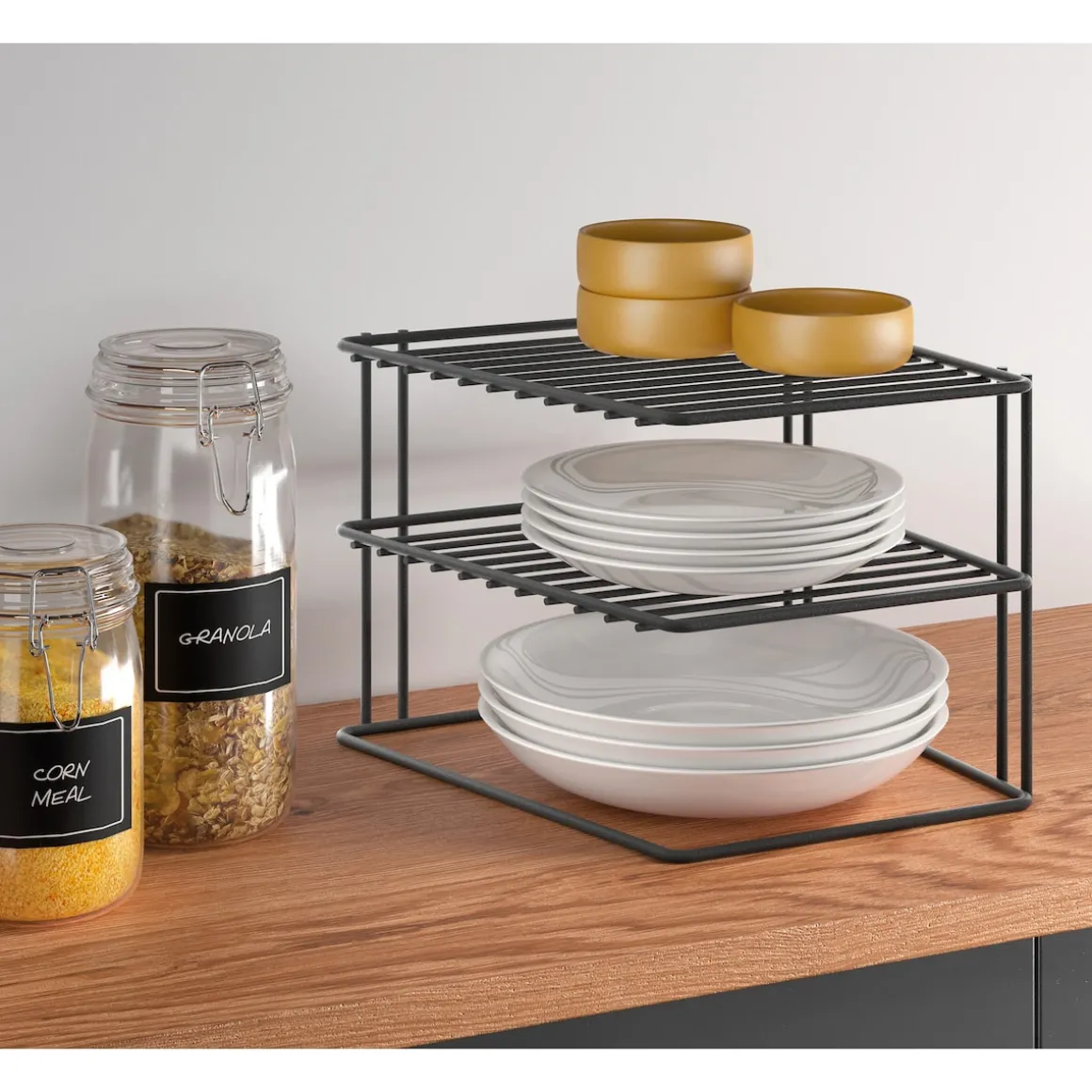 Oft ist im Schrank oder im Regal noch reichlich Platz nach oben, doch niemand möchte hohe Türme aus Tellern oder Gläsern bauen. Um den vorhandenen Platz dennoch optimal zu nutzen, gibt es den Palio LAVA Eckschrankeinsatz von Metaltex. Das quadratische Regal besteht aus zwei Etagen, auf denen sich nach Belieben Gläser, Teller oder Schüsseln abstellen lassen. Sie erhalten somit eine Ablagefläche mehr, auf die Sie direkt zugreifen können, ohne größere Mengen Geschirr bewegen zu müssen. Das ist nicht nur praktisch und spart Zeit, sondern schafft auch Ordnung in der Küche und sieht aufgeräumter aus. Zur schönen Optik trägt nicht zuletzt die mattschwarze TouchTherm-Beschichtung bei, die sowohl rostbeständig und kratzfest als auch antistatisch ist.