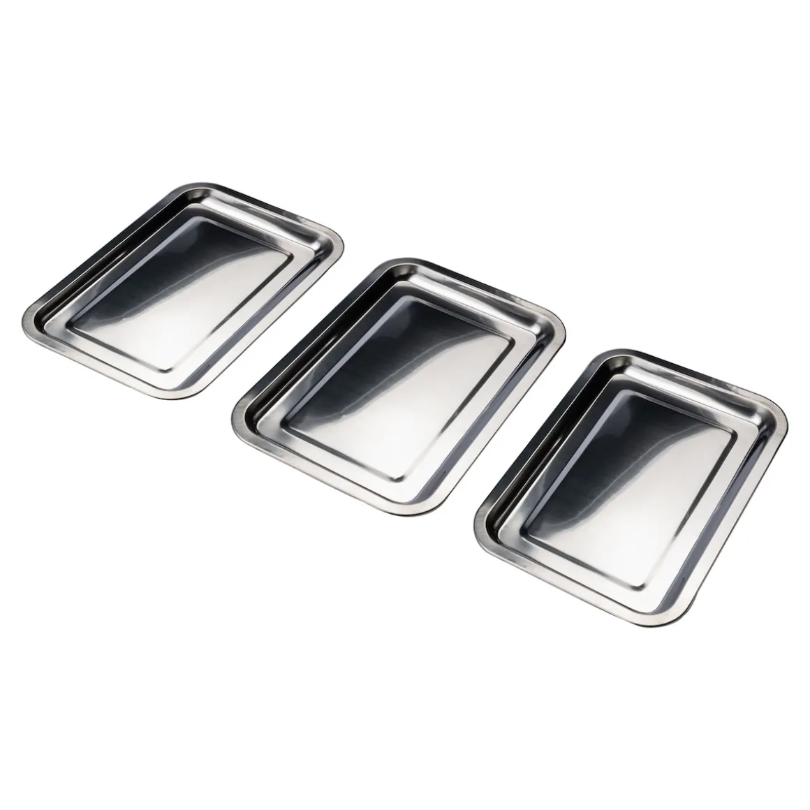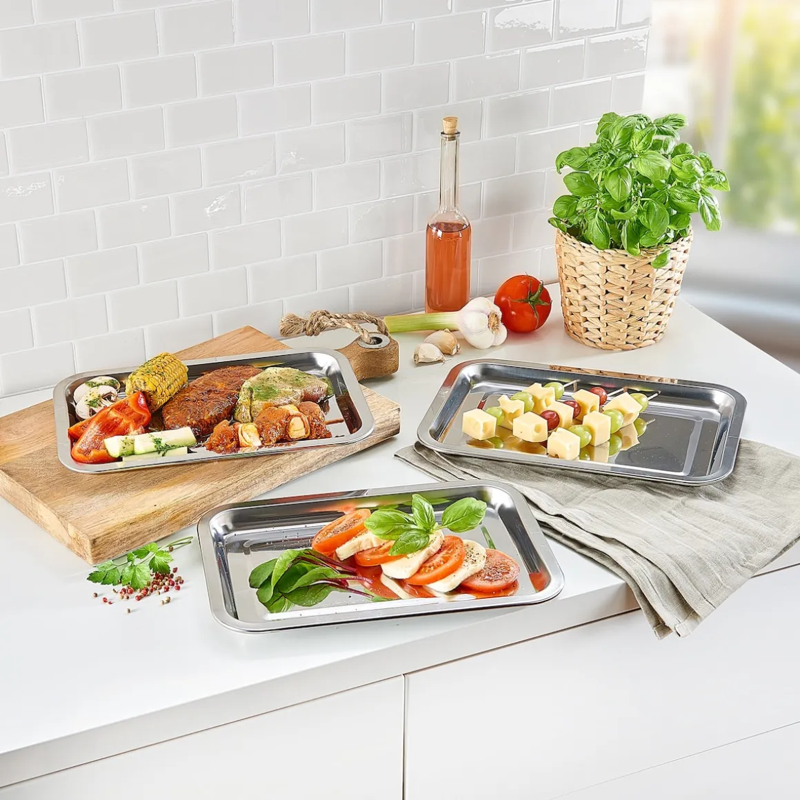 Mit diesem edlen Trio holen Sie sich praktische Helfer in die Küche: Sie eignen sich perfekt als Panierstraße für Schnitzel, Käse und Co. Aber auch als Tablett machen Sie eine gute Figur, um Wurst- oder Käseplatten für festliche Buffets zu servieren.