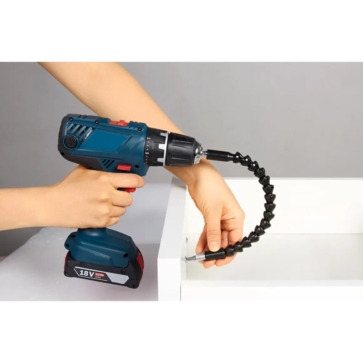 Dieser flexible Schrauberaufsatz gehört in den Werkzeugwagen jedes Hand- und Heimwerkers. Einfach ins Bohrfutter des Schraubers eindrehen, Bit in den Schnellwechsler stecken – losschrauben! Die Verlängerung lässt sich in jede Position biegen und erlaubt so das Schrauben selbst an schwer zugänglichen Stellen.