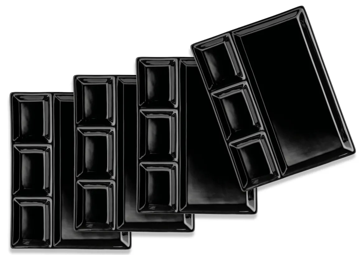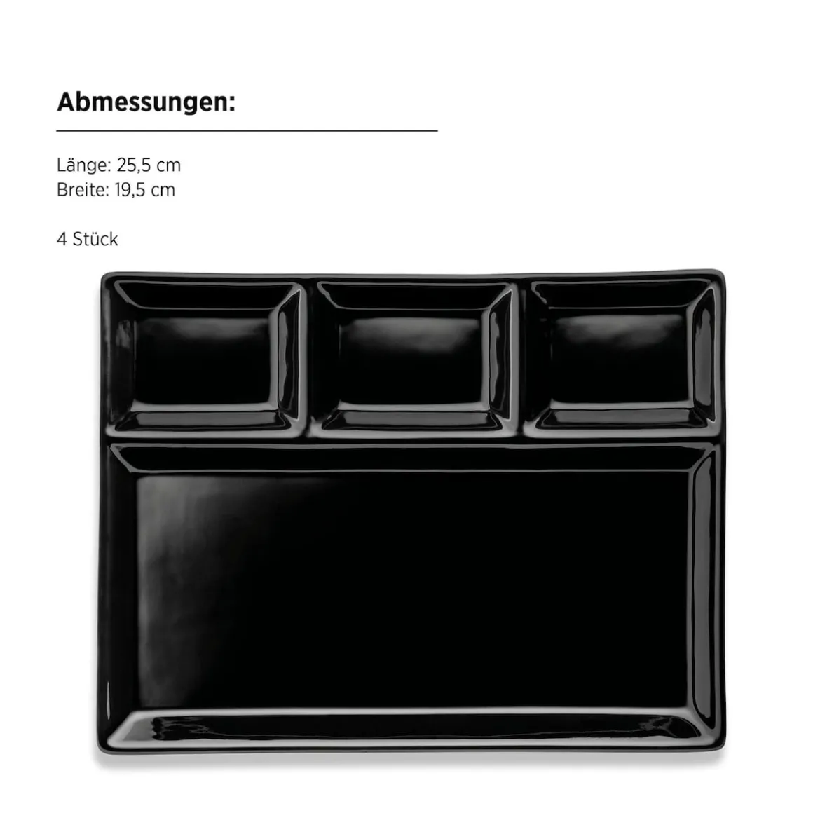 Diese robusten, vielseitigen, zeitlosen Teller der Marke MÄSER werden Sie nicht mehr missen wollen. Egal ob für Fondue oder BBQ, für Salate, Antipasti oder Fingerfood: dank der praktischen 4-fach Unterteilung mit hohem Rand lässt sich jede Speise sauber und getrennt voneinander anrichten. Unerwünschtes Vermischen von Lebensmitteln, Ineinanderlaufen von Saucen und Dressing, nasses Brot und matschiges Gemüse gehören dank der abgetrennten Fächer der Vergangenheit an. Auch einsetzbar als Servierplatte für Snacks. Spülmaschinen- und Mikrowellentauglich, aus hochwertigem New Bone Material.