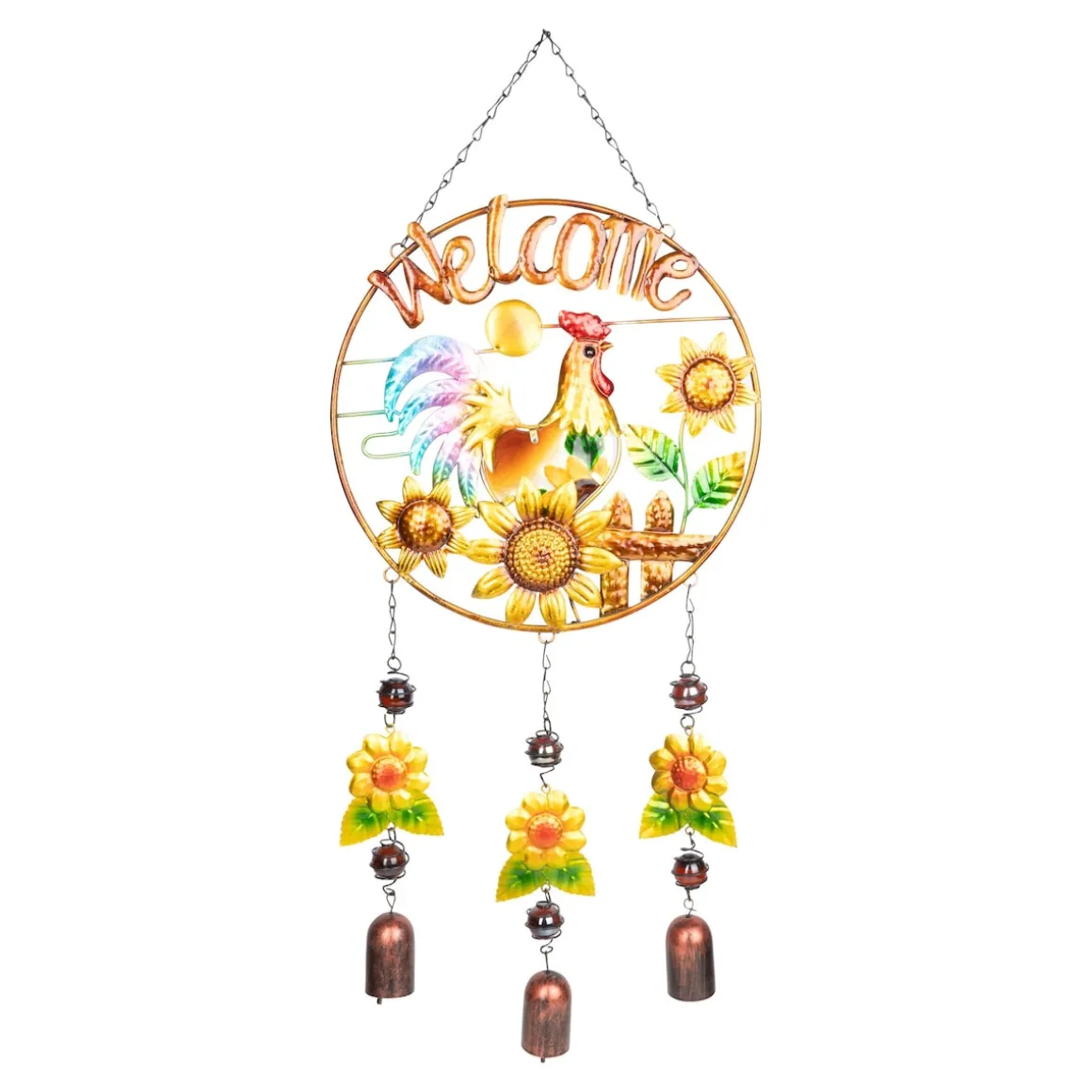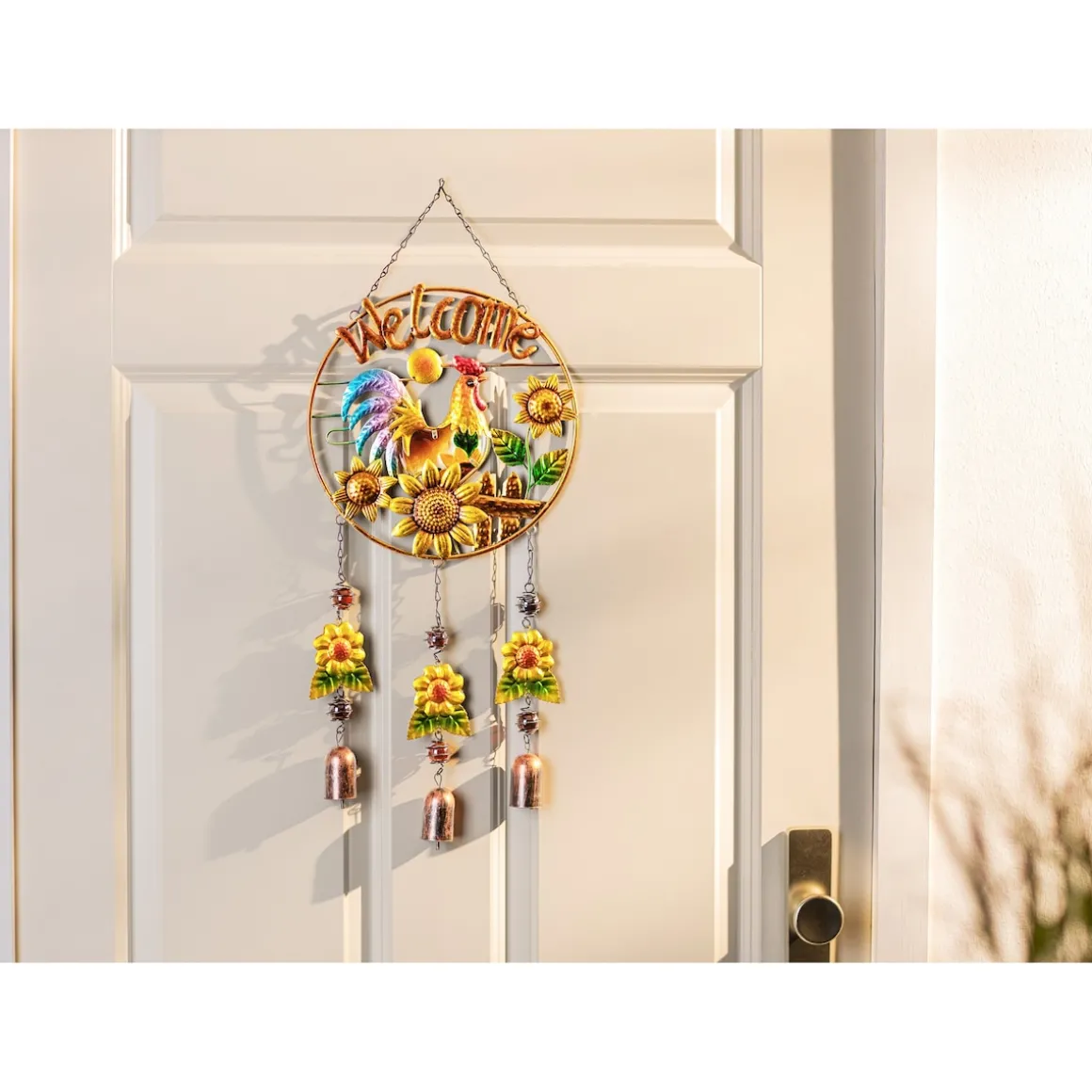 Mit diesem prächtigen Kunstwerk begrüßen Sie Ihre Gäste besonders herzlich. Der stolze Hahn, umgeben von strahlenden Sonnenblumen und sanft klingenden Glöckchen, sorgt für eine einladende Atmosphäre und bringt ländlichen Charme in Ihren Eingangsbereich.