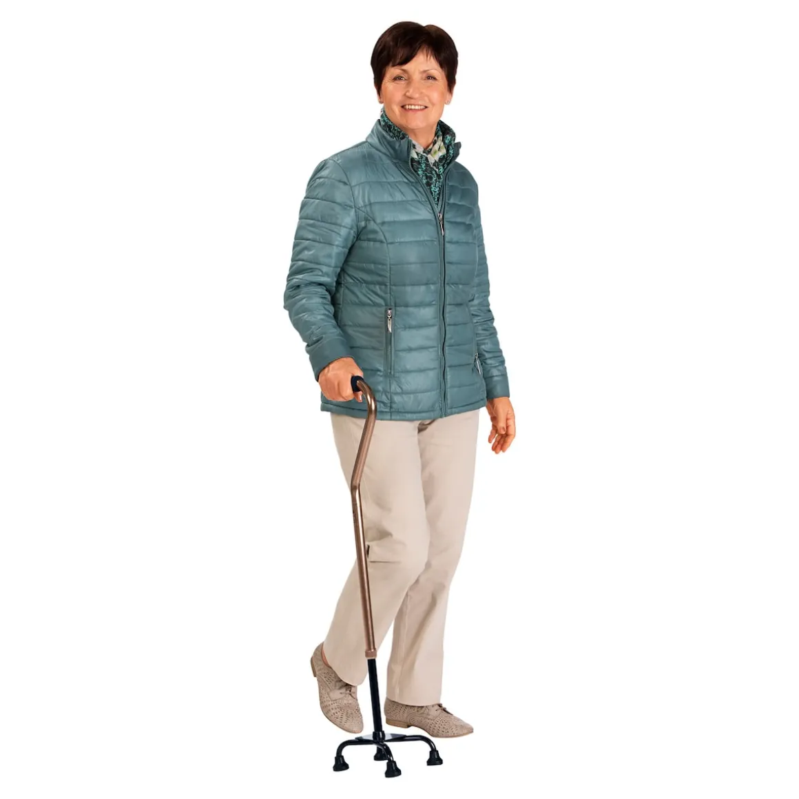 Unsere Vierfußgehilfe bietet Ihnen Sicherheit und Komfort im Alltag. Mit einer höhenverstellbaren Reichweite von 72 bis 95 cm passt sie sich perfekt an Ihre Bedürfnisse an. Die ergonomischen Handgriffe sorgen für einen bequemen Halt, während die rutschfesten Gummifüße sicheren Stand auf jedem Untergrund gewährleisten. Hergestellt aus robustem Aluminium, ist sie zudem besonders langlebig und zuverlässig.