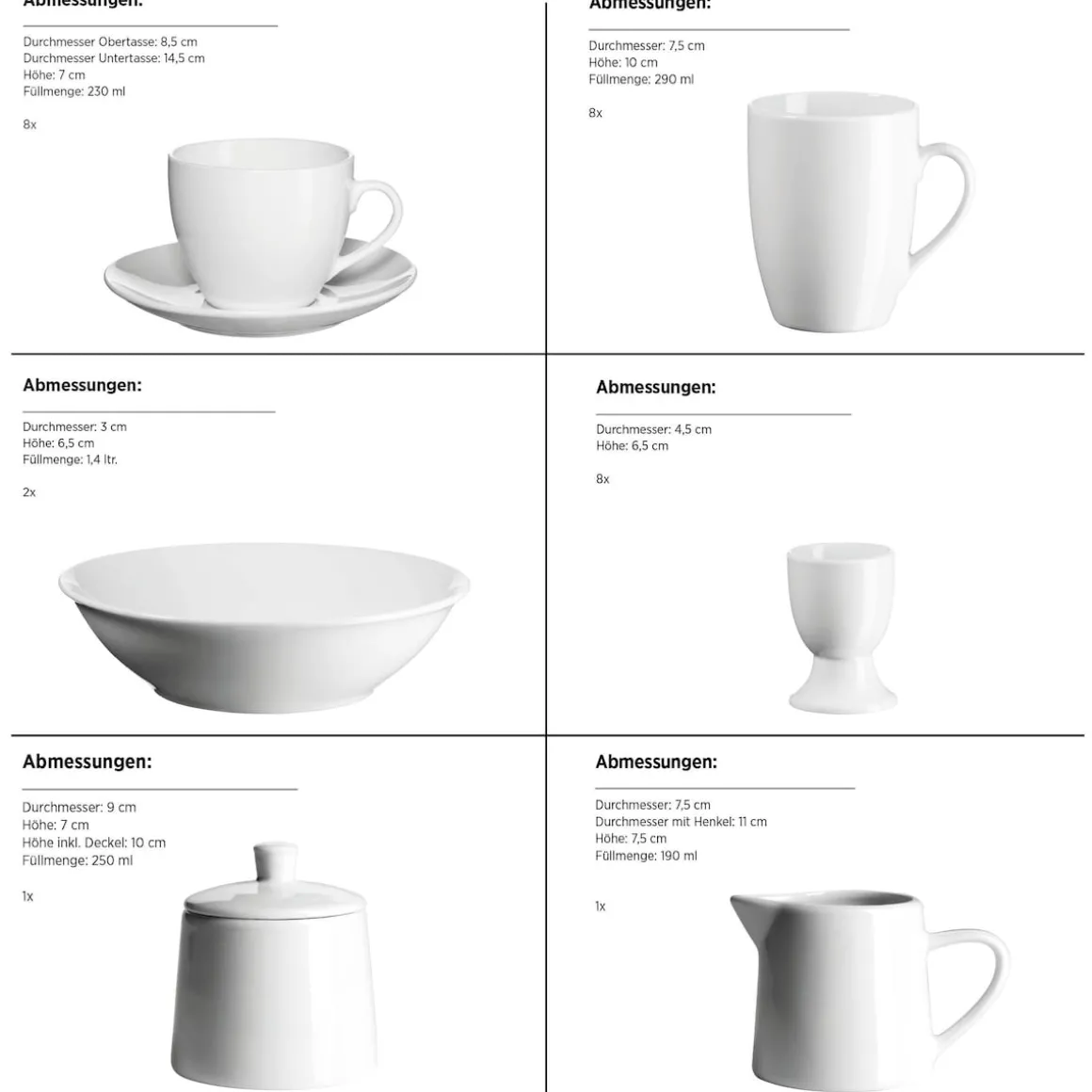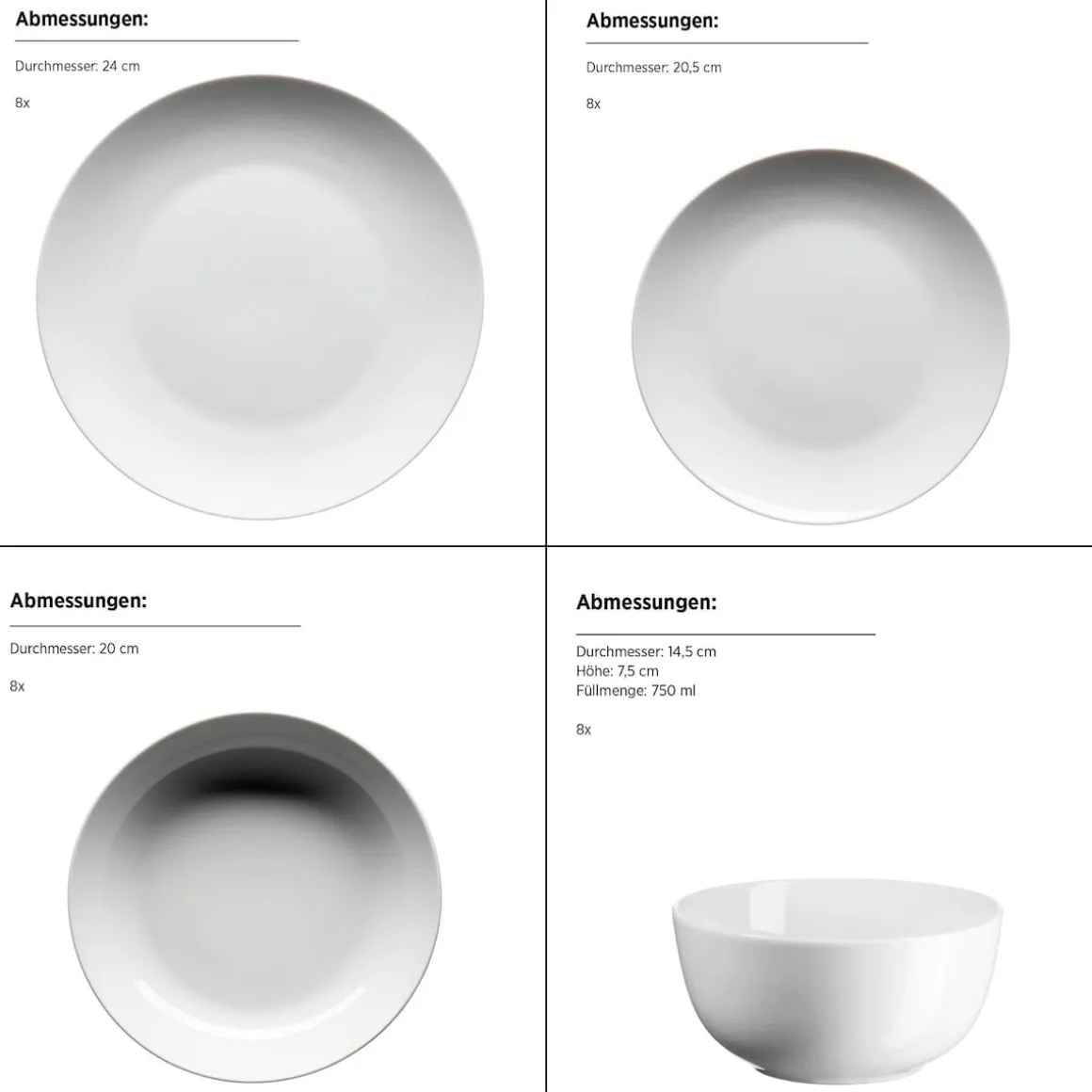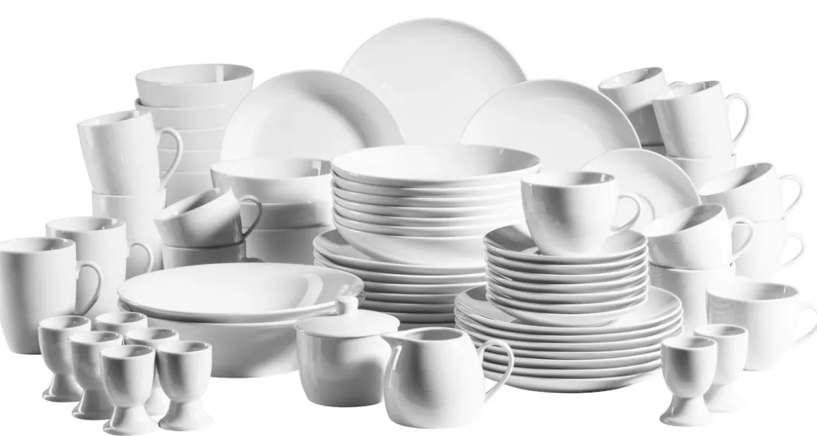 Dieses 68-teilige Service Set aus weißem Porzellan enthält