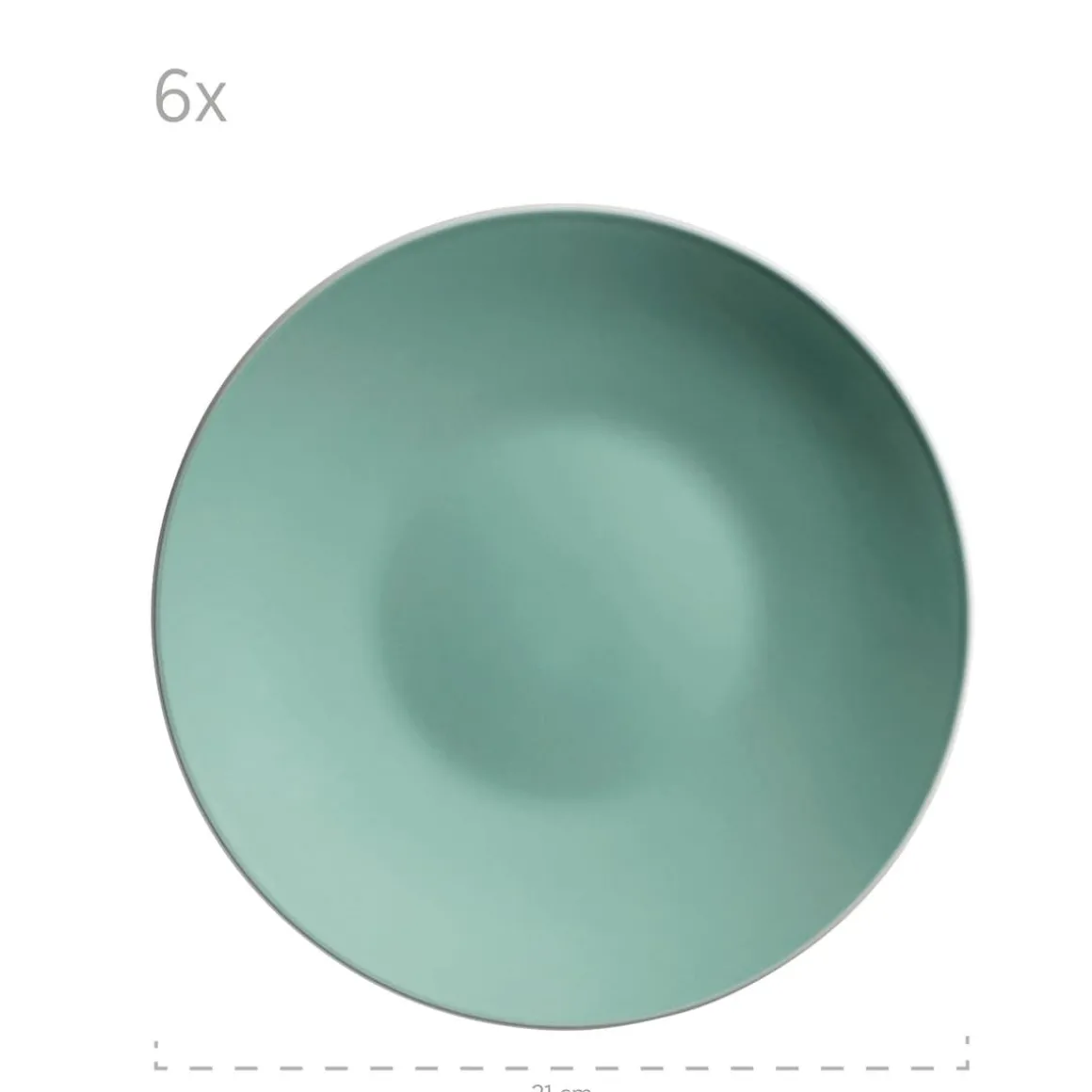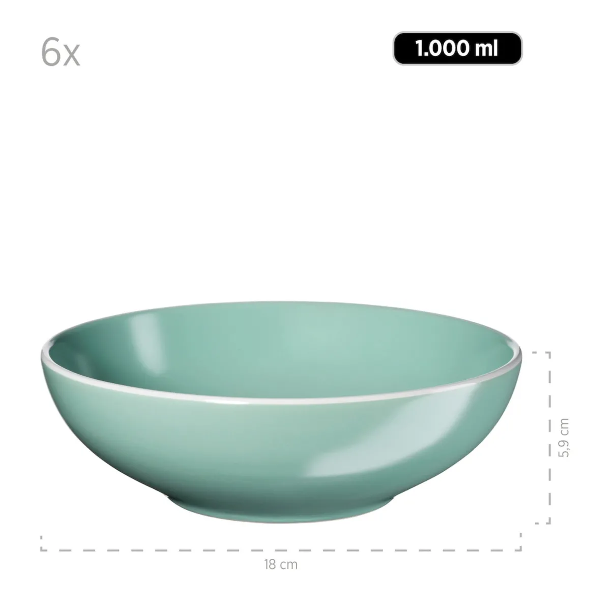 Dieses moderne und freundliche Geschirrset für 6 Personen umfasst 6 flache Speiseteller (Ø 27 cm), 6 Dessertteller (Ø 21 cm), 6 großzügige Müslischalen bzw. Suppenschalen (Ø 18,5 cm, 800 ml Füllmenge) und 6 Kaffeebecher (380 ml)