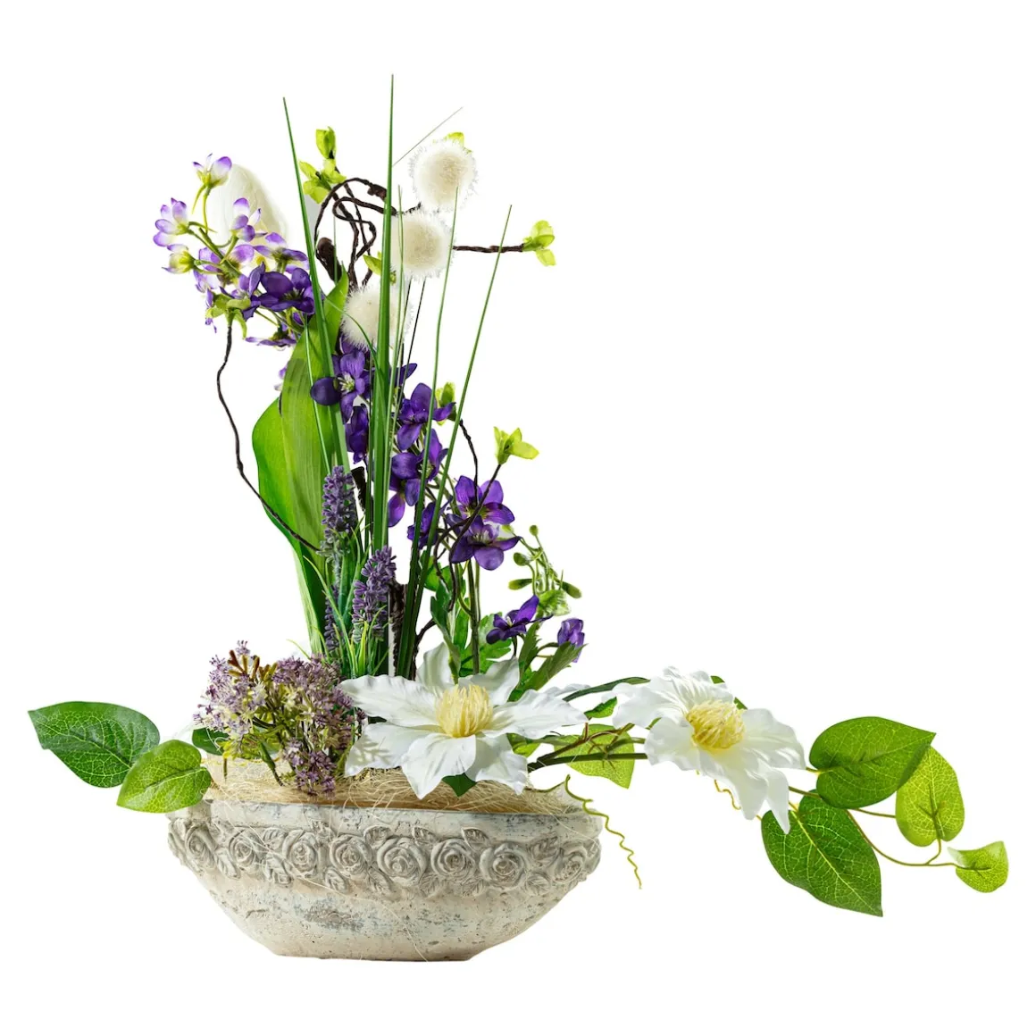 Clematis und Rittersporn, umrahmt von Gräsern und Ranken – können Sie sich an diesem Gesteck auch nicht sattsehen? Kein Wunder – diese imposante Schönheit zieht mit ihren leuchtenden Farben und ihrer üppigen Formenvielfalt alle Blicke auf sich. Die dezente Keramikschale mit den umlaufenden Ornamenten passt perfekt dazu.