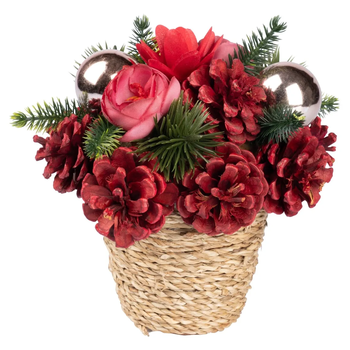 Das festliche Gesteck mit roten Zapfen verleiht Ihrem Zuhause weihnachtlichen Glanz. Mit echten Kiefernzapfen, Kugeln und grünen Zweigen gestaltet, bringt dieses Arrangement natürliche Eleganz und Wärme in jeden Raum. Ideal als Tischdekoration oder Fensterbank-Schmuck, sorgt es für eine festliche Stimmung und zieht alle Blicke auf sich. Die hochwertige Verarbeitung macht dieses Gesteck zu einer langlebigen Dekoration, die jedes Jahr aufs Neue begeistert!