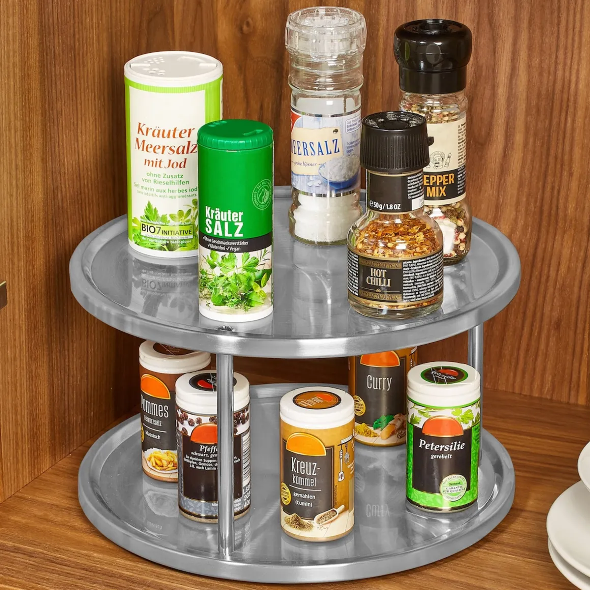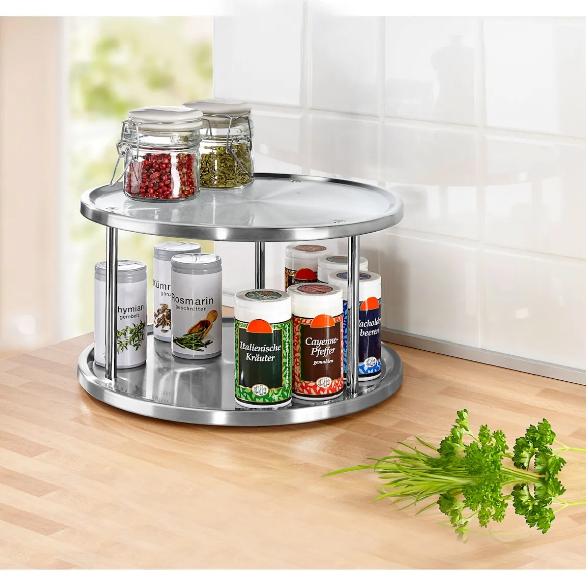 Mit seiner edlen Optik macht das Schrankrondell aber nicht um Schrank eine gute Figur, sondern bietet sich auch als dekorative Ordnungslösung für die Arbeitsplatte an. Besonders Hobbyköche lieben das Doppeldecker-Rondell, denn seine beiden Etagen lassen sich nutzen, um häufig verwendete Gewürze, Kräuter, Öle und Essige aufzubewahren. Langes Kramen im Gewürzregal gehört damit der Vergangenheit an, denn Salz, Safran oder das gute Walnussöl sind immer nur einen Dreh entfernt.