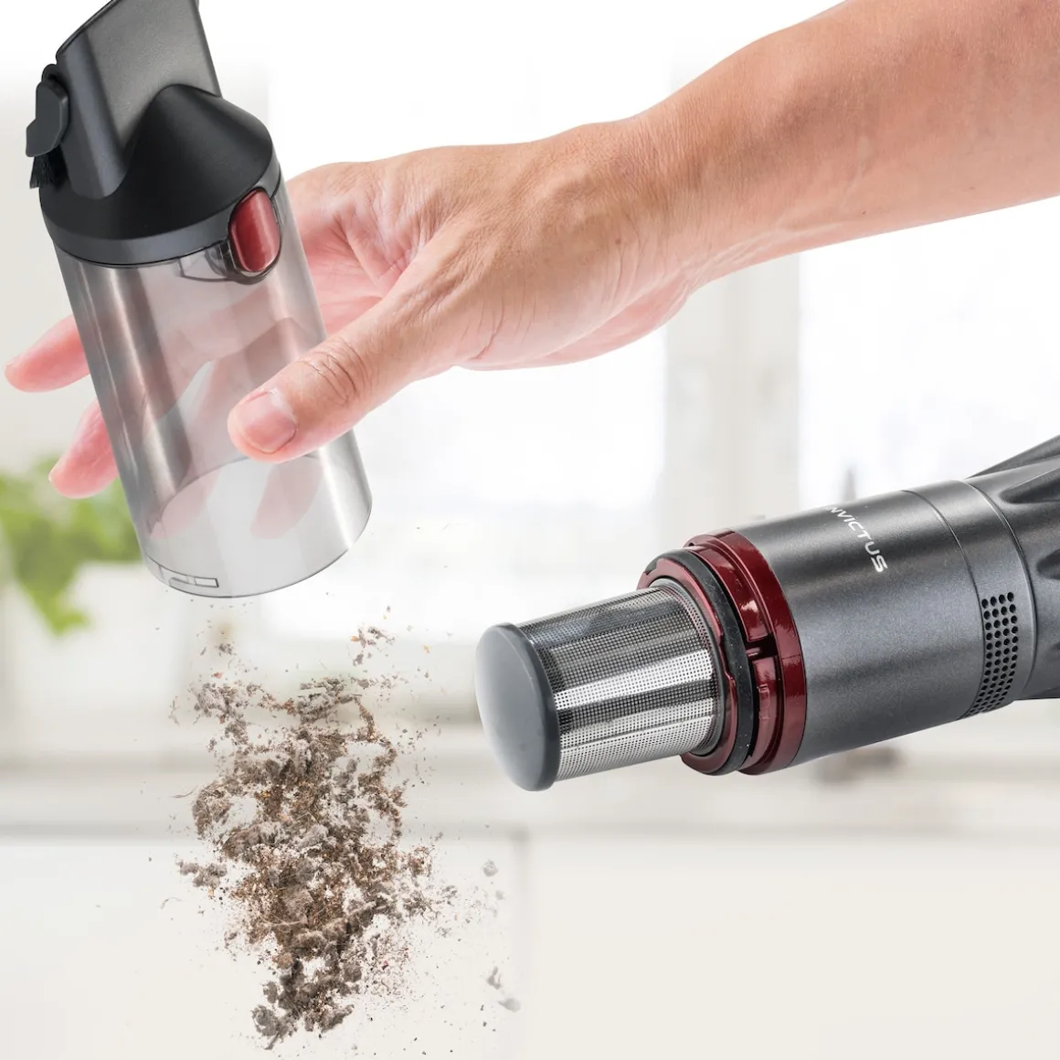 Ist der Staubbehälter gefüllt, lässt er sich ganz bequem und hygienisch per Knopfdruck entleeren, ohne mit dem eingesaugten Staub und Schmutz in Berührung zu kommen. Nach Gebrauch wird der Staubsauger einfach auf die Ladestation gestellt, wo er sich platzsparend aufbewahren lässt und zugleich für seinen nächsten Einsatz aufgeladen wird. Der Lithium-Ionen-Akku ist innerhalb von drei bis vier Stunden vollständig aufgeladen und bietet dann für bis zu 16 Minuten maximale Saugkraft.