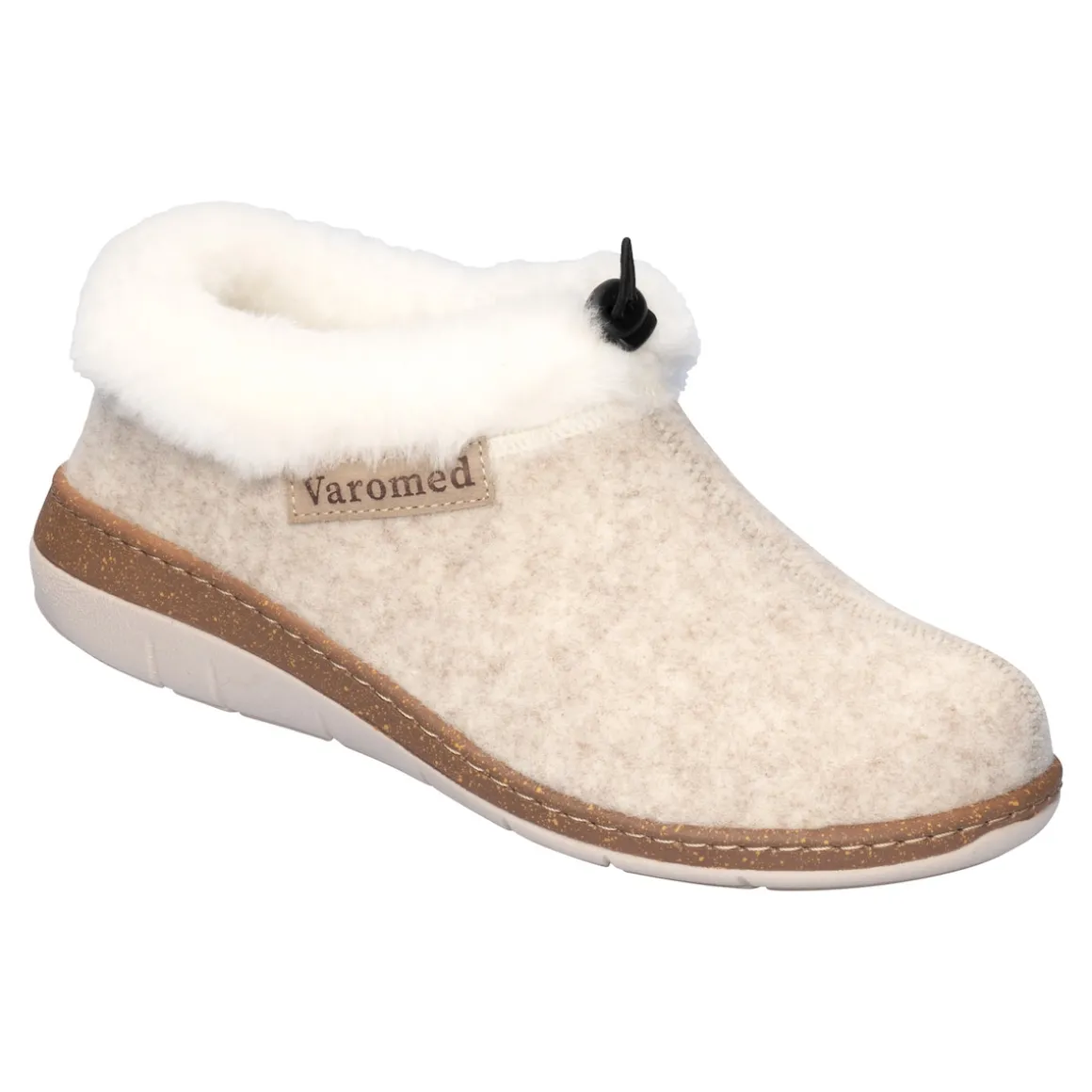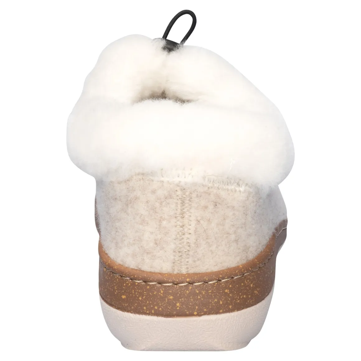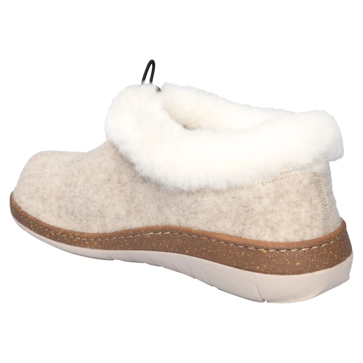 Gemütlicher Hausschuh mit angenehmer Keilhöhe aus robustem Filzmaterial. Durch den Gummizug an den Fuß anpassbar für optimalen Halt. Die bequeme, natürliche Fußform und die PU-Sohle sorgen für ein herrliches, wolkenweiches Gehgefühl. Herausnehmbar Einlegesohle, durch persönliche Einlagen ersetzbar.