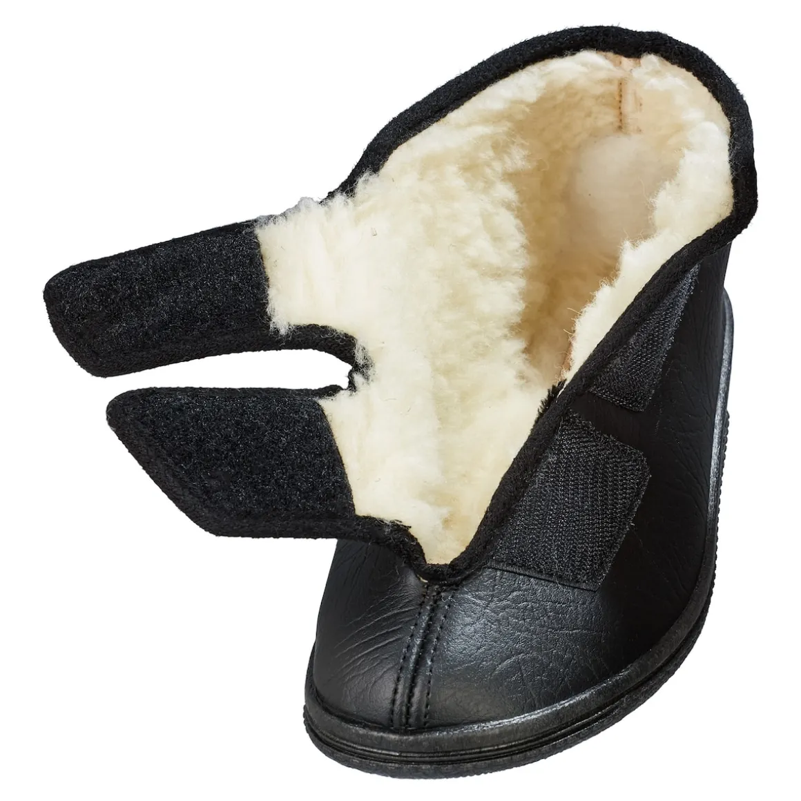 Weit zu öffnen, mit 2 Klettverschlüssen individuell einstellbar. Mit kuscheligem Futter aus Schurwolle. Obermaterial aus Lederimitat, Decksohle aus Schurwolle. Rutschhemmende TR-Laufsohle.
