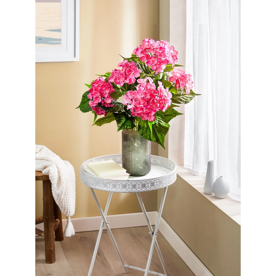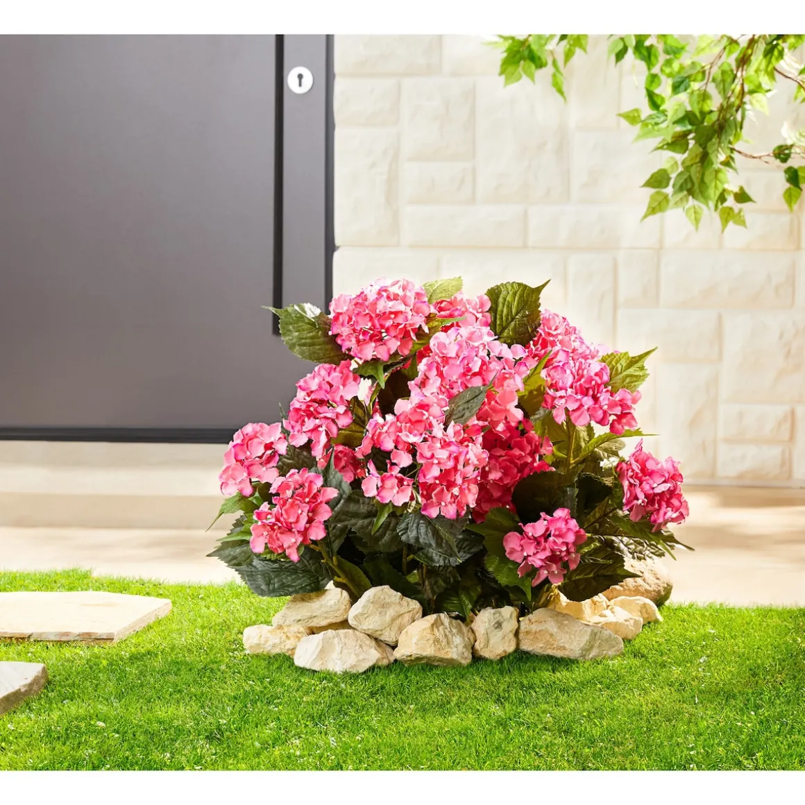 Die verblüffend realistische Optik der farbenprächtigen Blüten entlockt Ihren Besuchern gewiss Bewunderung und Lob. Die üppige, imposant blühende Kunst-Hortensie ist eine wahre Zierde für alle Wohn- und Außenbereiche.