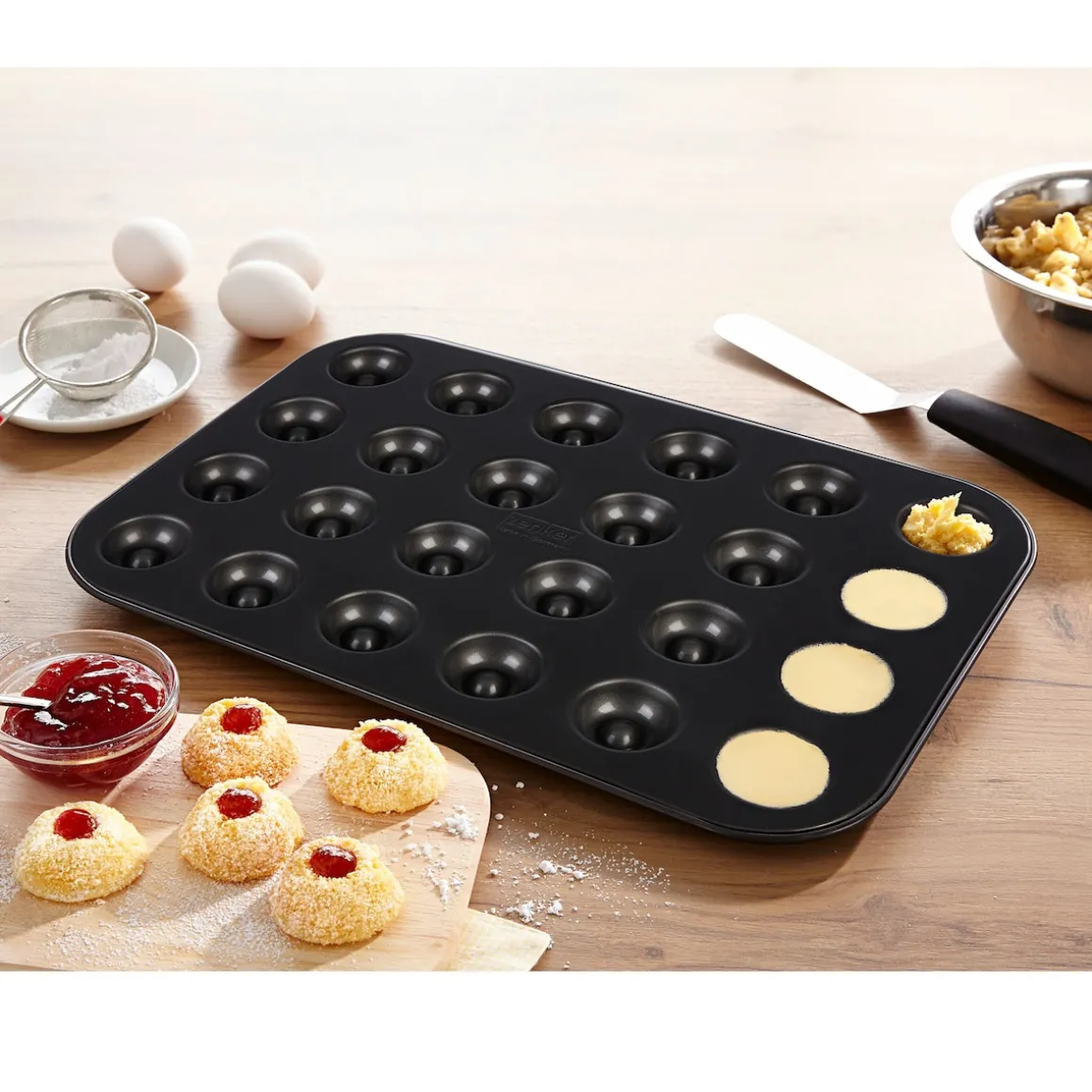 Köstliche Husarenkrapfen oder Engelsaugen? Egal, wie sie genannt werden – eines ist sicher: Mit diesem Backblech gelingen Ihnen endlich alle 24 Stück gleichmäßig. Die hochwertige ILAG-Spezial-Antihaftbeschichtung garantiert zudem das einfache Lösen des Gebäcks aus der Form.