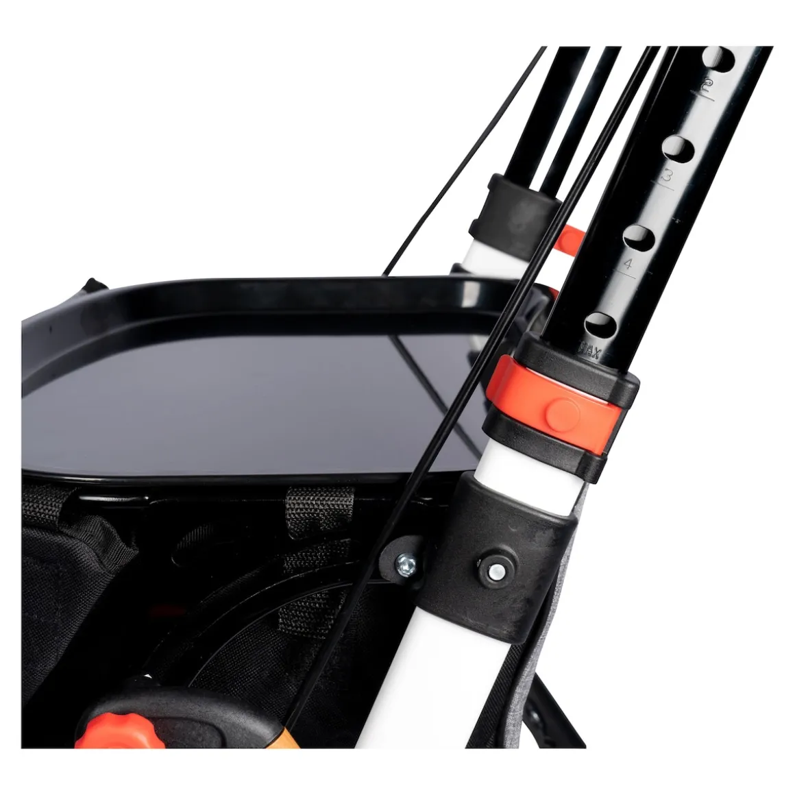 Der höhenverstellbare Griff (85-97 cm) sorgt für eine individuelle Anpassung an Ihre Körpergröße und ermöglicht Ihnen ein komfortables und ergonomisches Greifen. Die Feststellbremsen gewährleisten eine sichere Nutzung, während die Innenraum-Bereifung Ihre Böden vor Kratzern und Streifen schützt.