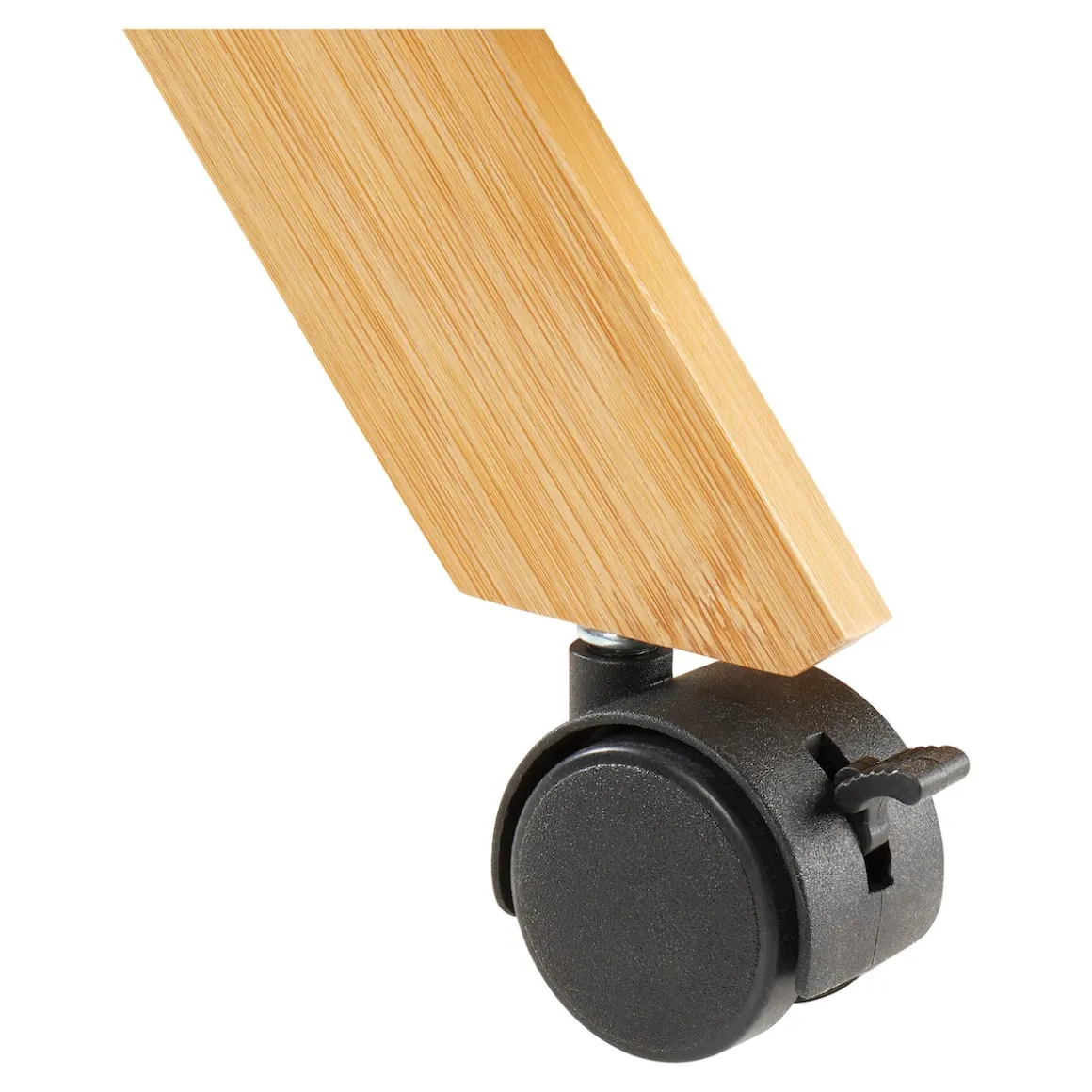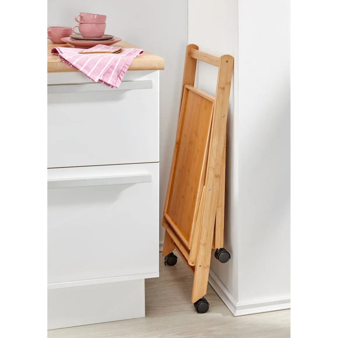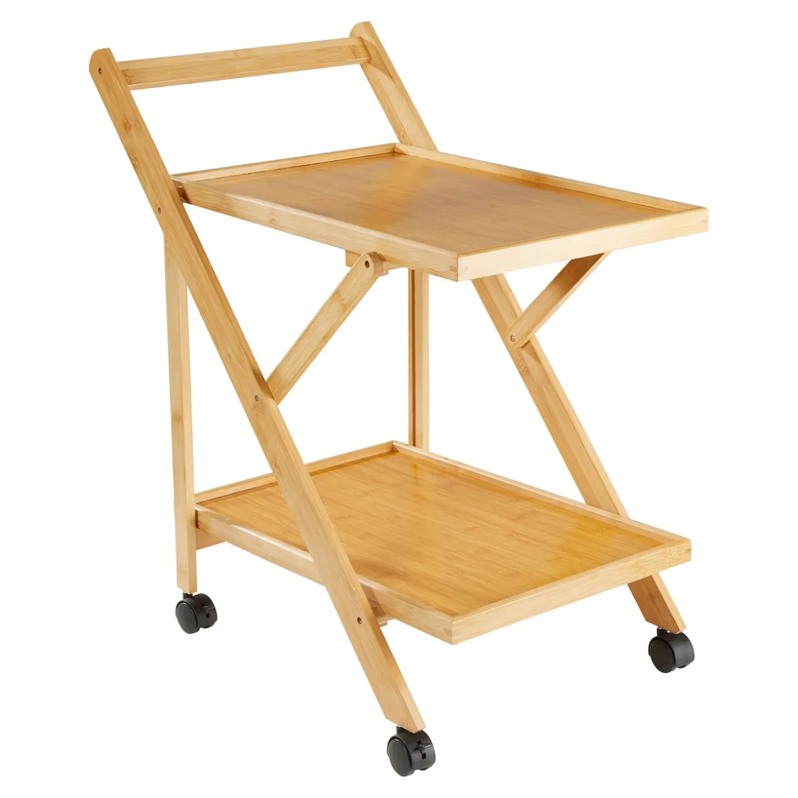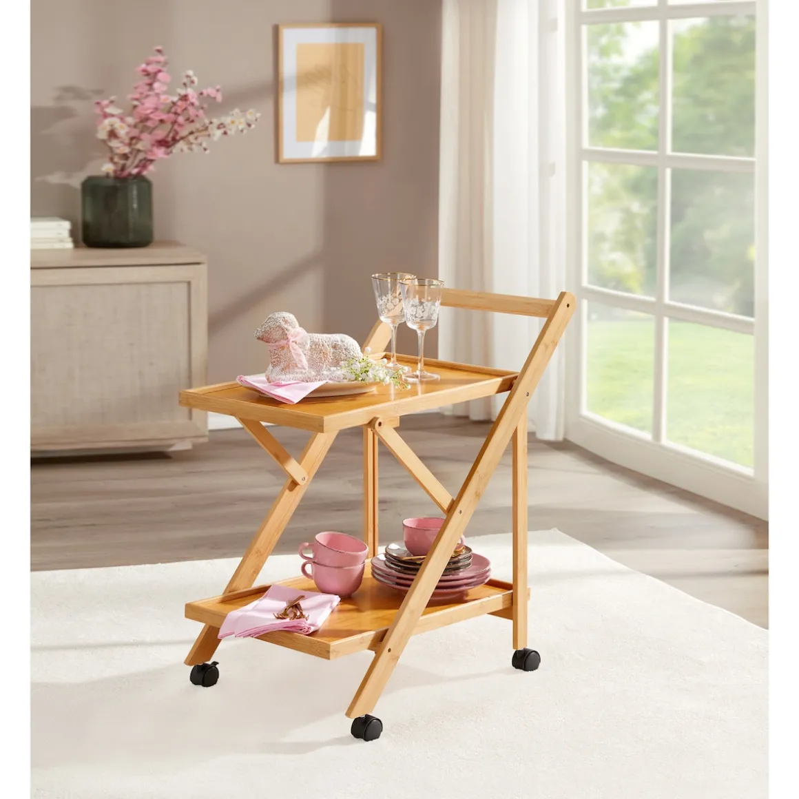 Dank diesem Servierwagen haben Sie stets alles in Griffweite, was an der Kaffeetafel oder beim Kochen benötigt wird: Auf den beiden großzügigen Ablageflächen finden Snacks, Küchenutensilien oder auch Fernbedienung, Zeitschriften und Co. ihren Platz. Der fein gemaserte Bambus wirkt dabei zeitlos schön und passt zu jedem Einrichtungsstil. Praktisch: Platzsparend zusammengeklappt, wartet der Servierwagen auf seinen Einsatz und ist blitzschnell aufgestellt. Dank seiner Rollen folgt er Ihnen überall hin, wo Sie ihn benötigen!