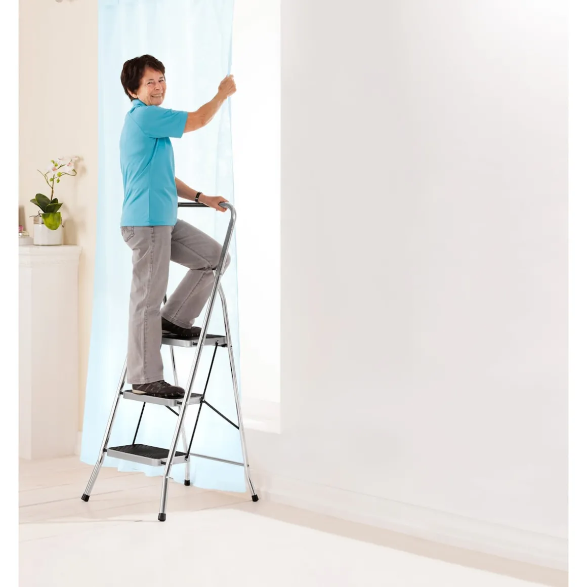 Ob die Blumenvase ganz oben im Küchenschrank oder die defekte Glühbirne in der Deckenleuchte im Flur, im Haushalt gibt es immer wieder Situationen, in denen man selbst auf Zehenspitzen nicht weiterkommt. Doch auf den nächstbesten Stuhl zu steigen, ist riskant und führt nicht selten zu Stürzen. Eine bequeme und vor allem sichere Lösung für Fälle, in denen die eigene Körpergröße nicht ausreicht, ist diese dreistufige Klapp-Trittleiter. Dank ihres leichten und robusten Gestells aus Aluminium lässt sie sich schnell hervorholen. Ausgeklappt findet die Leiter mit ihren Gummifüßen auf Fliesen aller Art über PVC bis hin zu Teppich auf jedem Untergrund sicheren Stand.