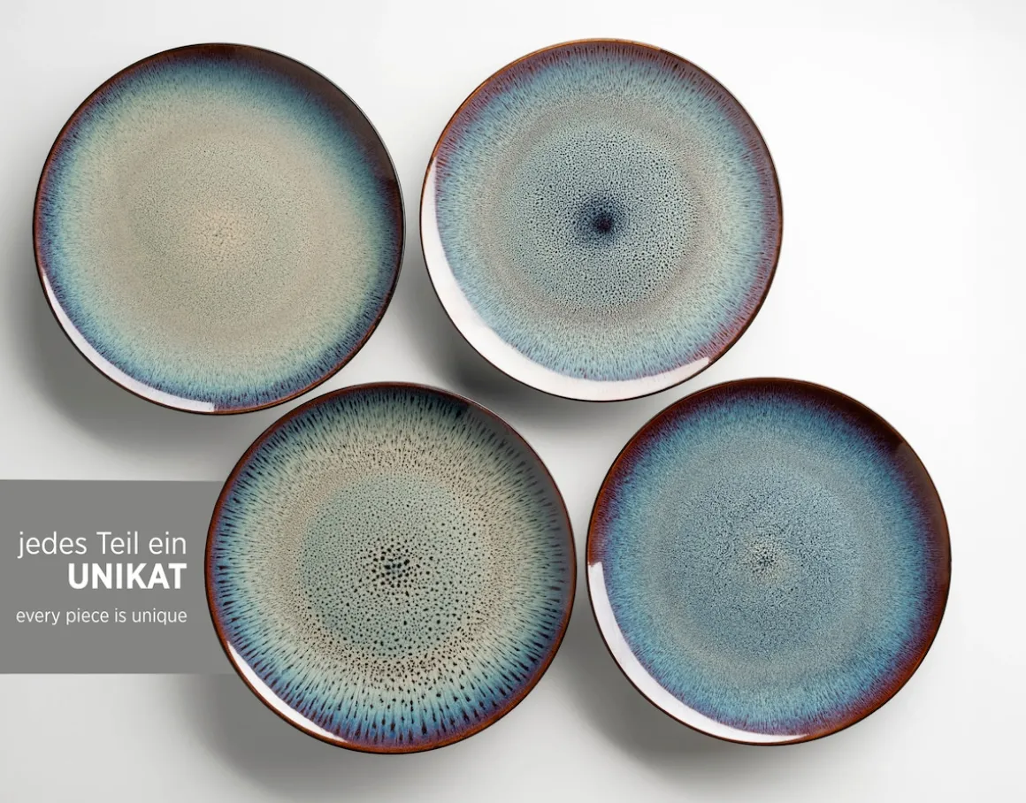 Die wunderschön leuchtenden Naturfarbtöne von Grün-Blau bis Rot-Braun bilden den perfekten Kontrast zur semimatt schwarzen Außenglasur. Die Farben fließen auf jedem Teil der Kollektion „Teona“ auf unterschiedliche Weise ineinander, so dass jeder Teller, jede Schale und jeder Kaffeebecher ein einzigartiges Farbmuster aufweisen. Die besondere Glasur, die die österreichische Traditionsmarke MÄSER für diese Kollektion verwendet, schimmert je nach Lichteinfall in verschiedenen Nuancen. Gefertigt aus hochwertigem Steinzeug (nicht zu verwechseln mit dem deutlich brüchigeren Steingut) ist die Keramikgeschirr Serie „Teona“ trotz ihrer außergewöhnlich Optik mikrowellen- und spülmaschinengeeignet und damit absolut alltagstauglich.