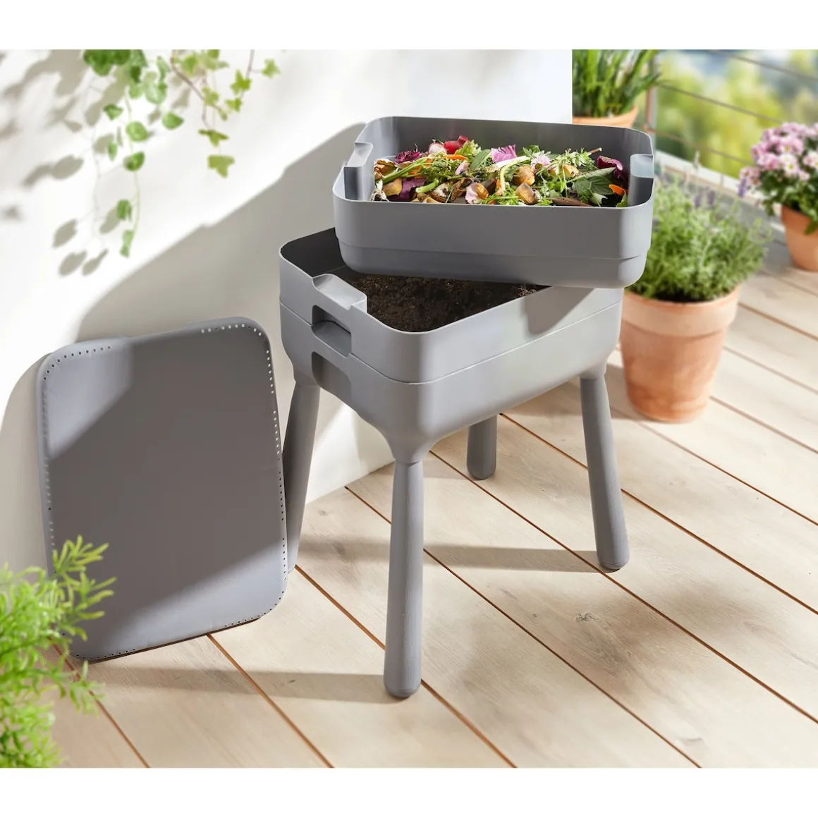 Verwandeln Sie Bioabfälle aus der Küche in nachhaltigen Pflanzendünger oder mithilfe von Würmern sogar in Humus. Dank des 3-Etagen-Konzeptes ist der Komposter nicht nur enorm leistungsfähig, sondern passt auch platzsparend auf Balkone. Das Ablassventil im unteren Teil sorgt für die bequeme Entnahme des produzierten flüssigen Pflanzendüngers. Der dicht schließende Deckel verhindert Geruchsbildung.