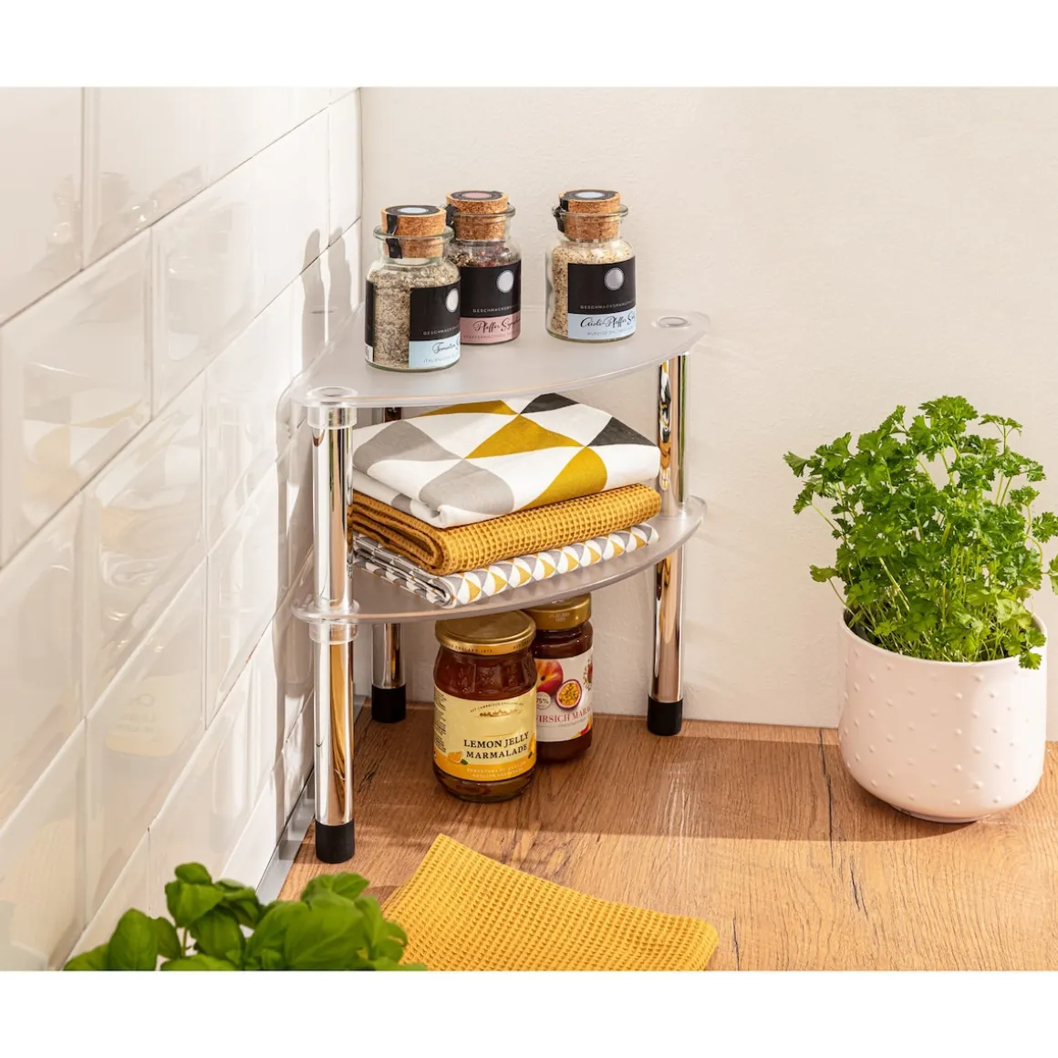 Stauraum in der Küche kann es nie genug geben: Das clevere Eckregal zaubert stilsicher einen Extraplatz in ungenutzten Ecken. Auf 2 Etagen finden Gewürze, Geschirrtücher u.v.m. ihren Platz. Auch ideal für Schmuck oder Badutensilien. So ist alles Wichtige stets griffbereit!