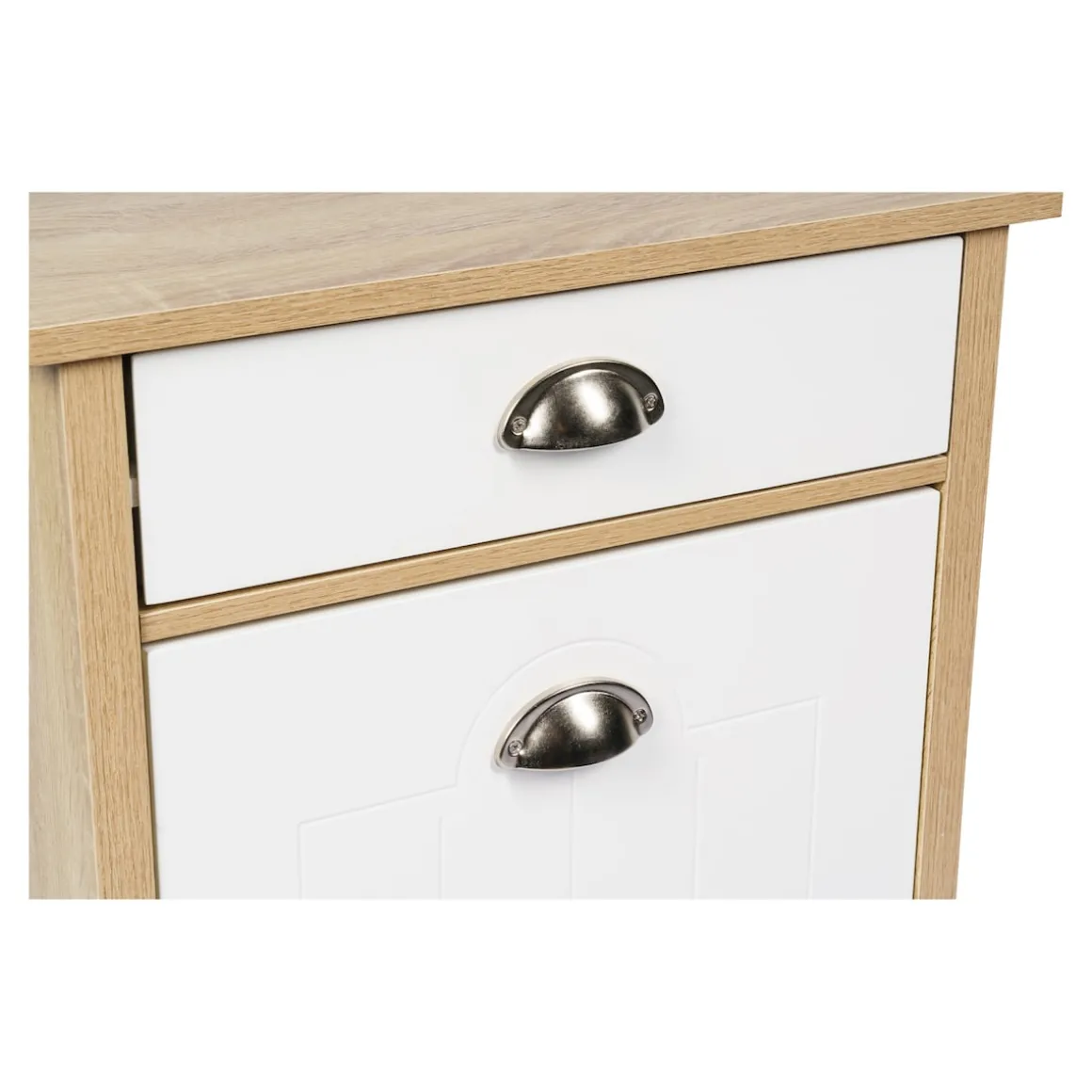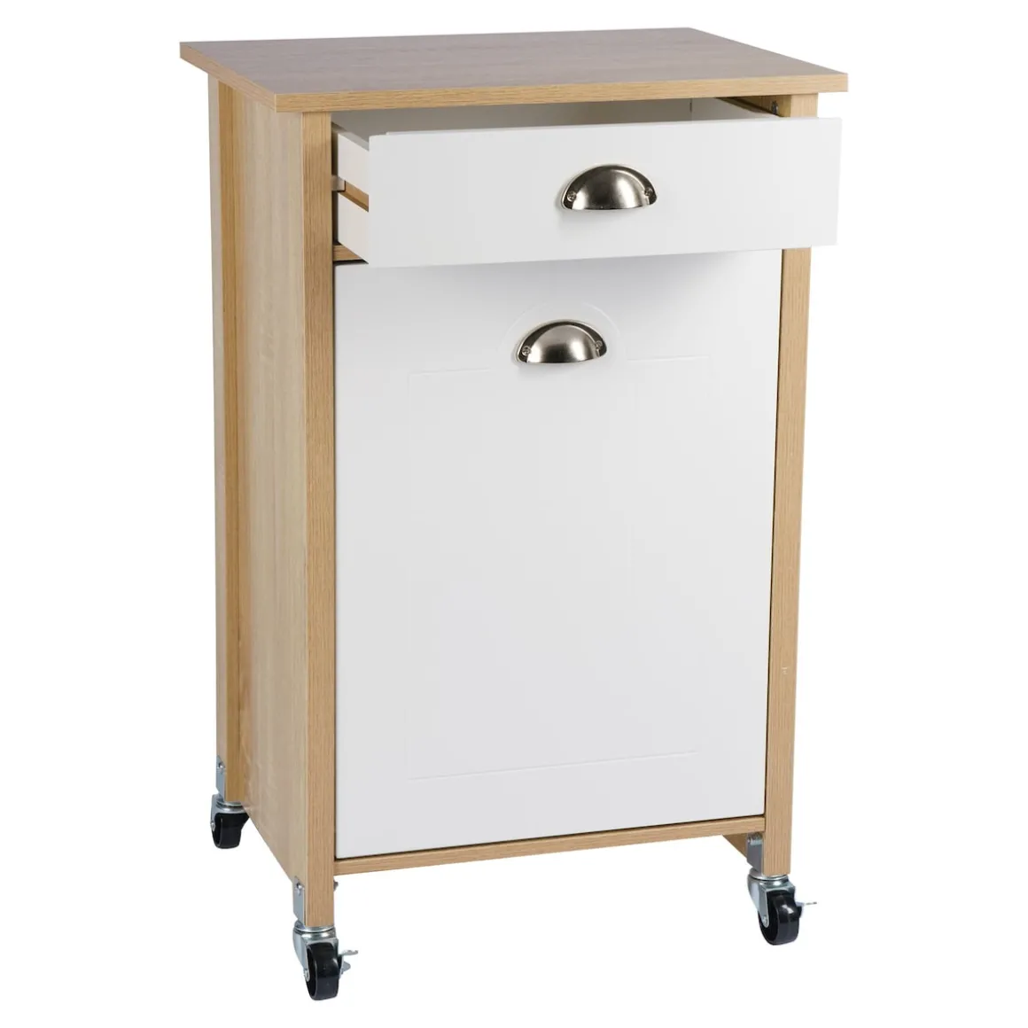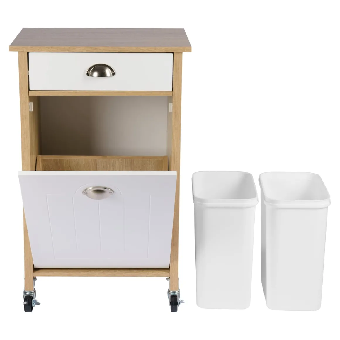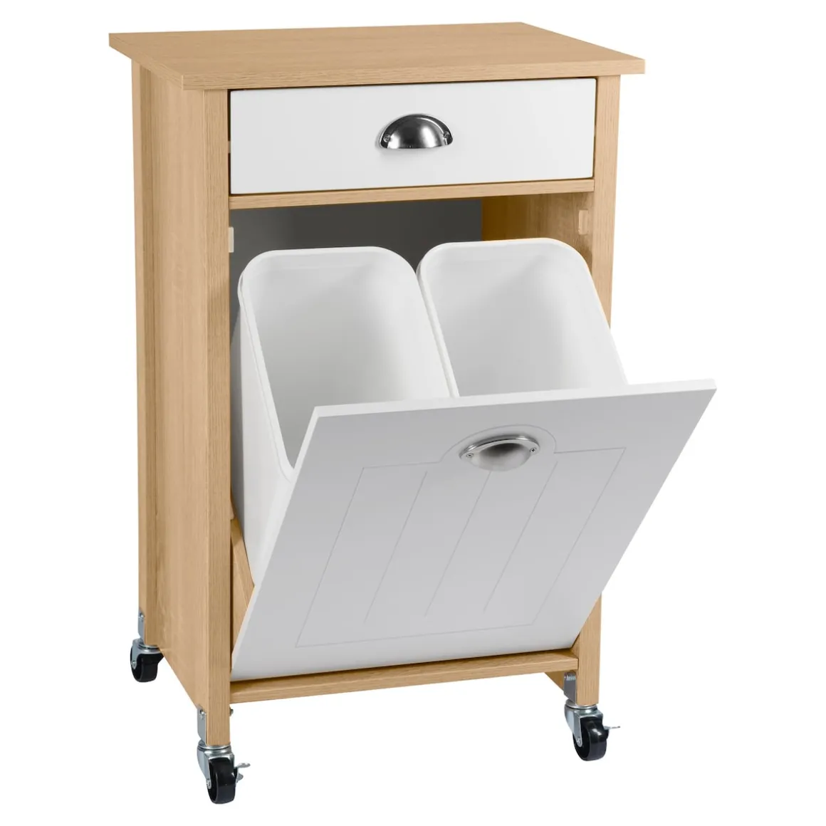 Der moderne Küchenwagen mit Mülltrennsystem schafft zusätzlichen Stauraum in der Küche. Im aufklappbaren Unterschrank befinden sich zwei herausnehmbare Abfalleimer zur Mülltrennung. Die Mülleimer besitzen ein Fassungsvermögen von je 15 Litern und sind mit Mülltütenbefestigungsringen ausgestattet. Über der Klappe ist eine Schublade angebracht, beide sind mit formschönen Metallgriffen versehen. In der zusätzlichen Aufbewahrungsmöglichkeit lassen sich Dinge wie Müllbeutel, Besteck oder andere Küchenaccessoires ordentlich und leicht zugänglich aufbewahren.