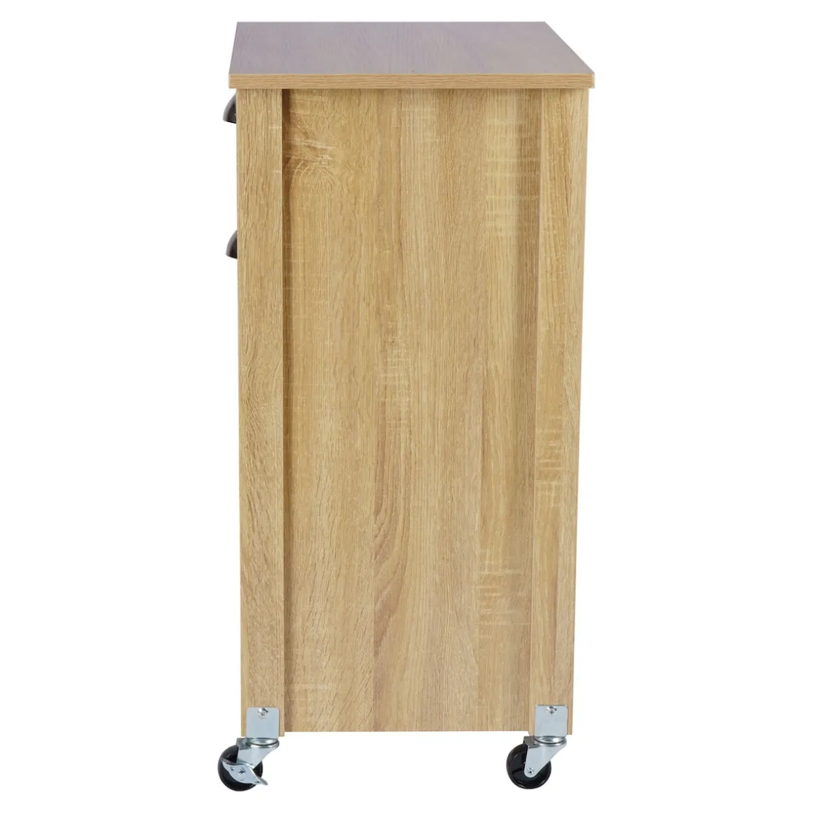 Die Abdeckplatte kann als Abstellfläche für Küchengeräte oder als Arbeitsplatte genutzt werden. Dank der vier stabilen Lenkrollen ist der Küchenwagen mobil einsetzbar. Damit eignet er sich auch für kleinere Küchen mit wenig Stellplatz. Der Wagen kann immer genau dorthin geschoben werden, wo er gerade benötigt wird. Zwei der vollbeweglichen Lenkrollen sind mit Feststellbremsen ausgestattet, wodurch ein ungewolltes Wegrollen verhindert wird. Mit dem attraktiven Design des stabilen Küchenwagens ist von außen nicht ersichtlich, dass er Mülleimer beherbergt. Der praktische Alltagshelfer integriert das Mülltrennsystem diskret in eine moderne, klassische oder rustikale Kücheneinrichtung und ist für Küchen jeder Größe geeignet.
