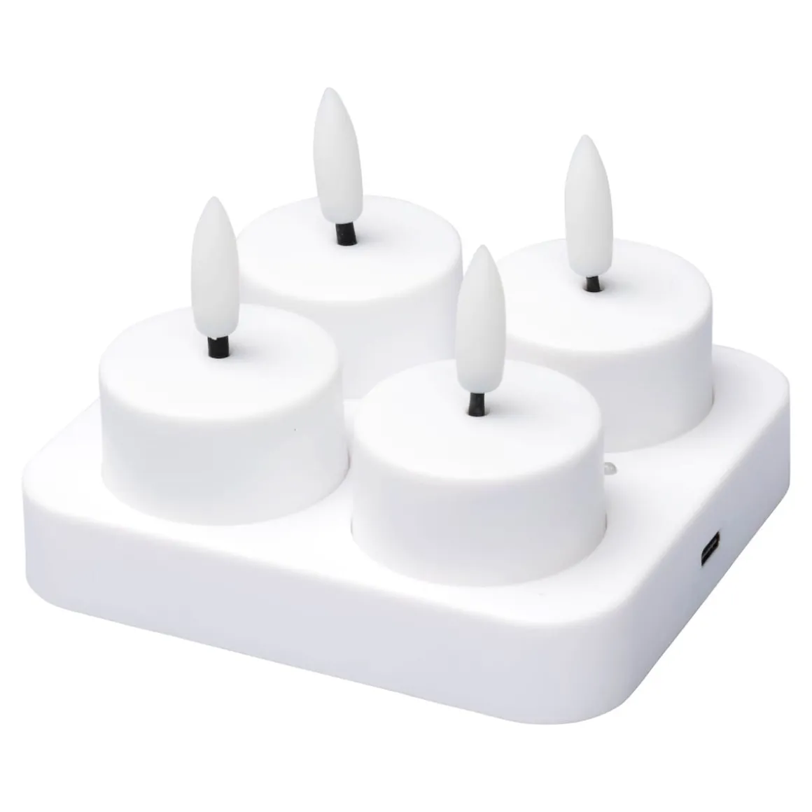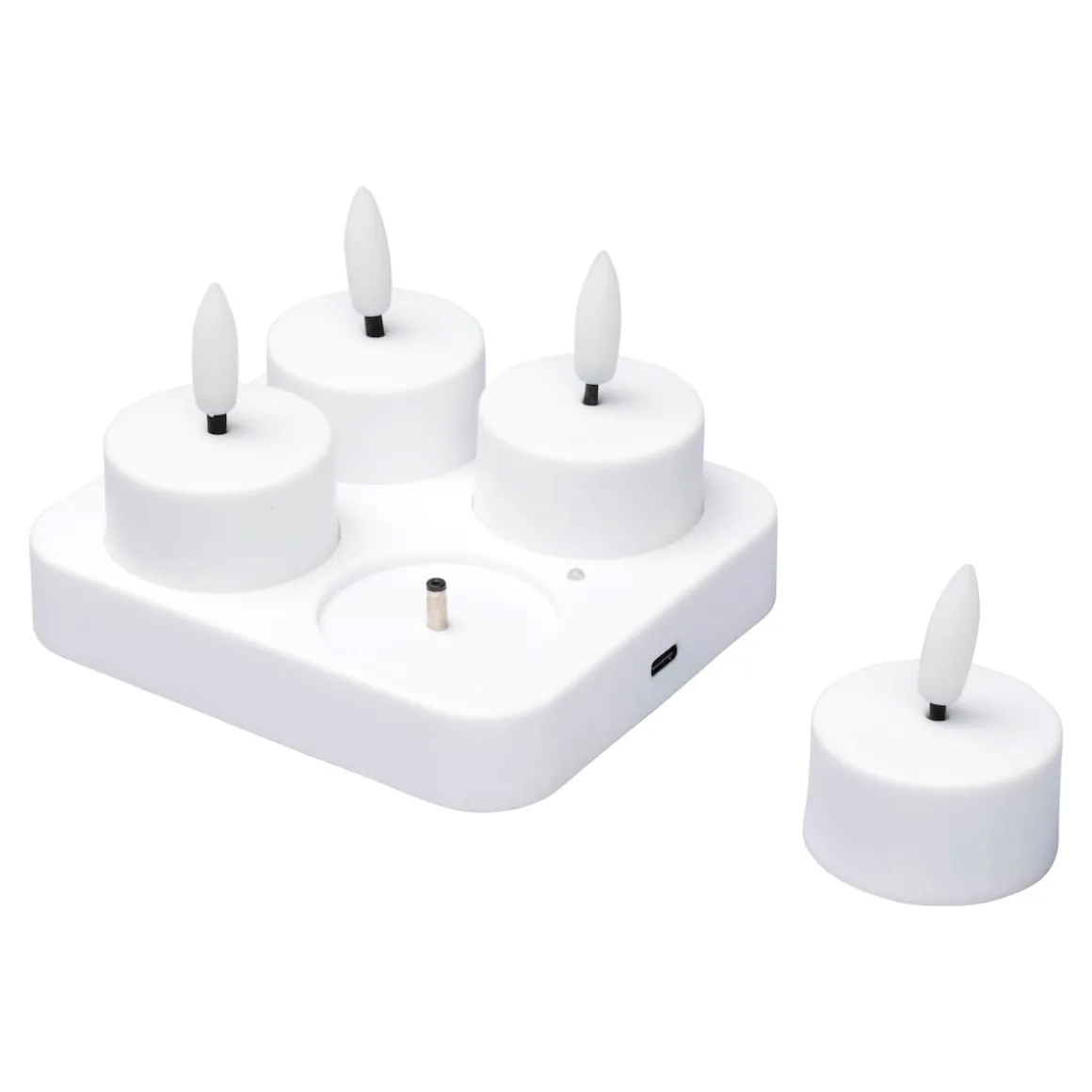 Das warme Flackern von Kerzenlicht gehört einfach zur Winterzeit dazu! Aber wer möchte schon mit tropfendem Wachs oder Brandflecken herumhantieren? Die flackernden LED-Teelichter bieten die perfekte Lösung – ohne Feuerzeug oder Streichholz. Stellen Sie die Teelichter einfach in die Ladestation, laden Sie sie auf und genießen Sie bis zu 12 Stunden lang ununterbrochenes Licht. Und das Beste daran: Kein lästiges Batteriewechseln mehr! Lieferumfang: Ladestation, USB-Kabel, 4 LED-Teelichter.